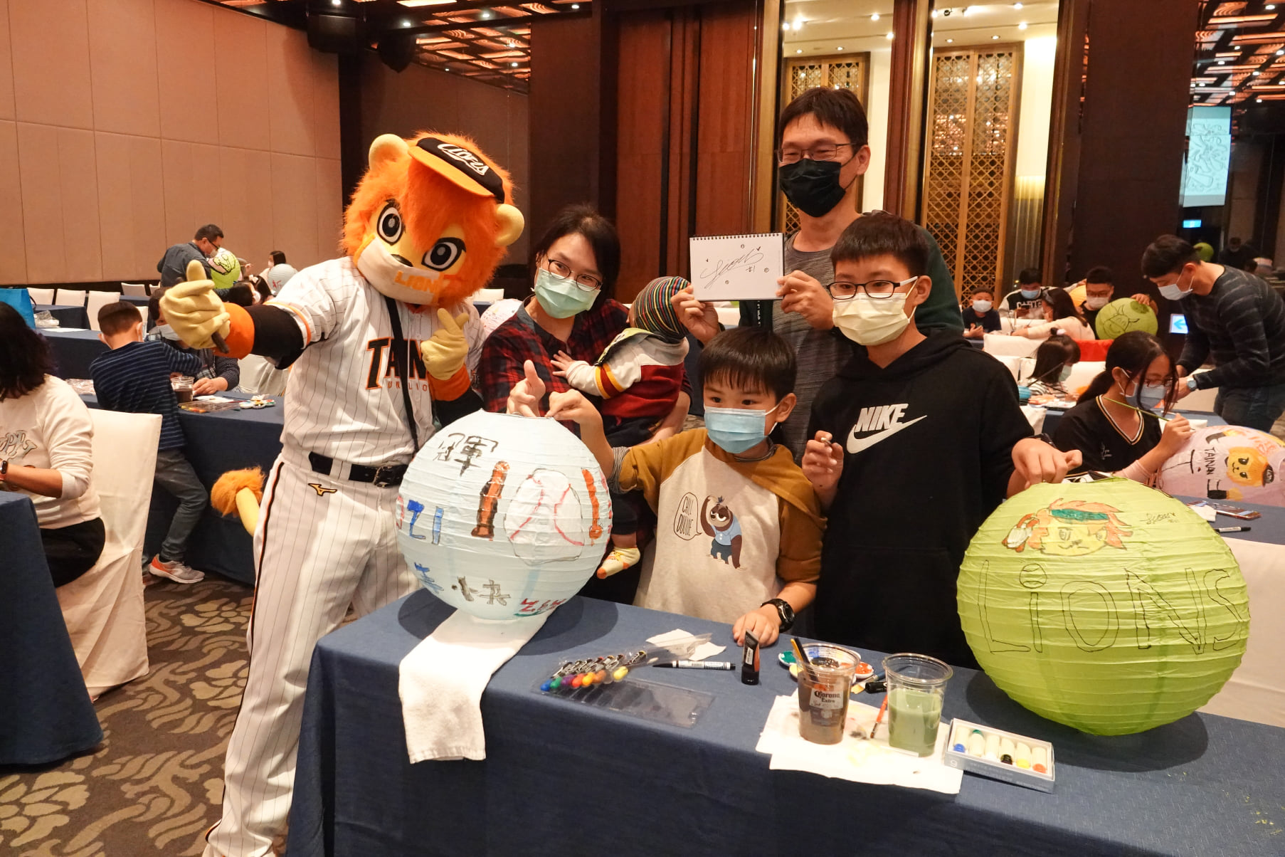▲ 台南晶英邀職棒球隊「統一7-ELEVEn獅」吉祥物萊恩共同舉辦彩繪燈籠活動,寫下願望並為新年祈福!