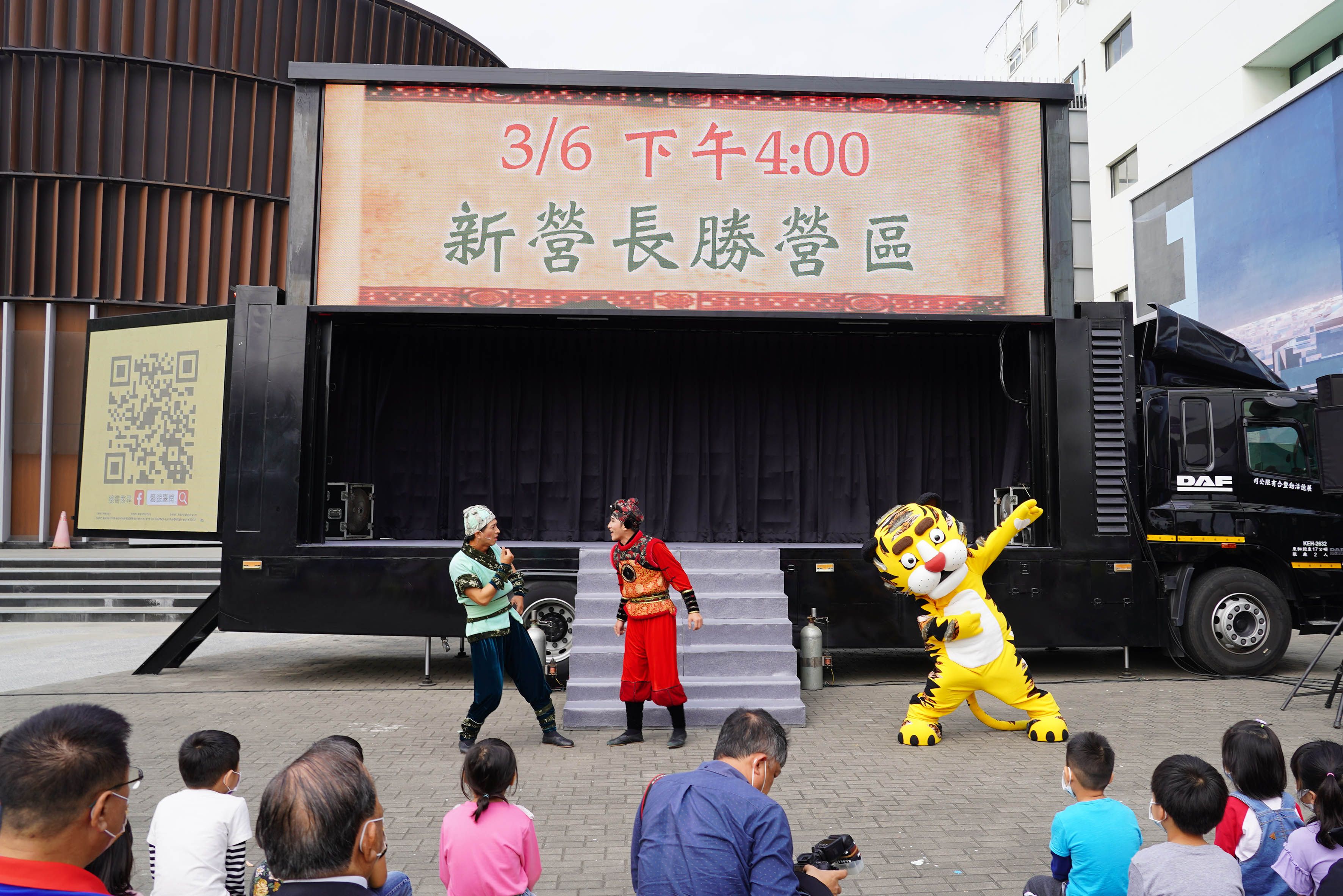 不同以往每場演出搭拆舞臺的形式,「藝如春風走透透」戶外演出設備以較輕便移動的行動舞臺車取代,讓民眾能更近距離接觸欣賞藝術。今日記者會也以行動舞臺車「開箱秀」開場,看似普通的17噸貨車瞬間變身為表演舞臺,而最受小朋友喜愛的「紙風車劇團」也帶來3月6日的開幕演出《武松愛老虎》精采片段。「武氏三兄弟」互相鬥嘴又與老虎比手畫腳,為3/6開幕熱鬧暖身,現場還「請示」長官是否能去長勝營區演出,逗得現場來賓笑聲不斷。