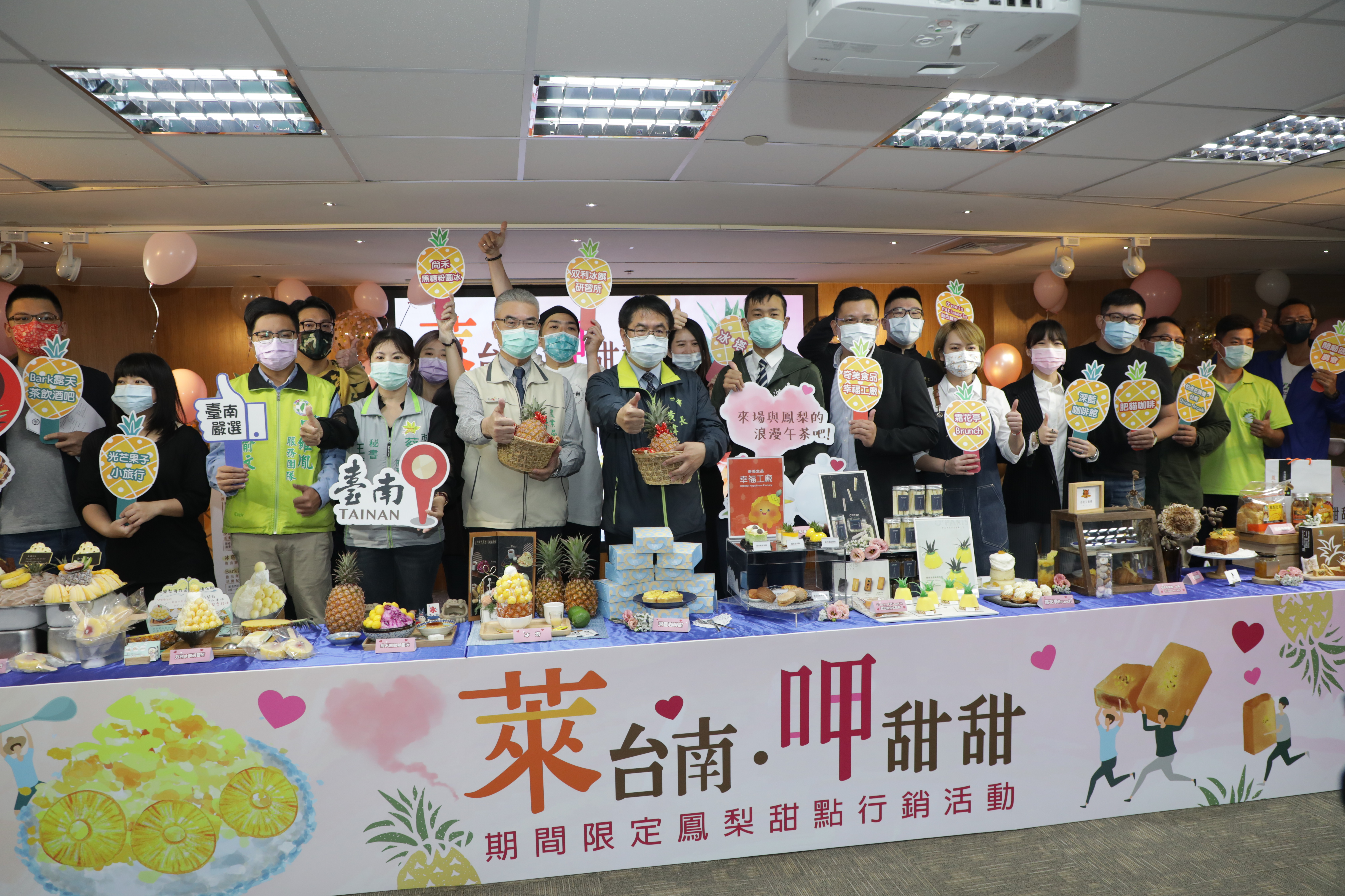 台南是充滿甜蜜幸福的城市,許多爆紅的甜點及冰店就在府城巷弄間,可以說整座城市都被甜點給包圍,4至5月為台南鳳梨的盛產期,台南市政府全力協助果農,今年媒合多家知名店,聯合推出鳳梨創意甜品及祭出優惠,用實際行動力挺鳳梨農,台南市長黃偉哲(25)日並親自主持期間限定鳳梨甜點行銷記者會,農業局長、本次媒合知名業者代表及市議員沈震東皆到場共襄盛舉,並切鳳梨蛋糕儀式,象徵開賣好業績,黃偉哲說,透過此次聯合活動,消費者可以在台南鳳梨產季時來台南,品嘗鳳梨華麗變身的好滋味,用行動支持鳳梨農。
