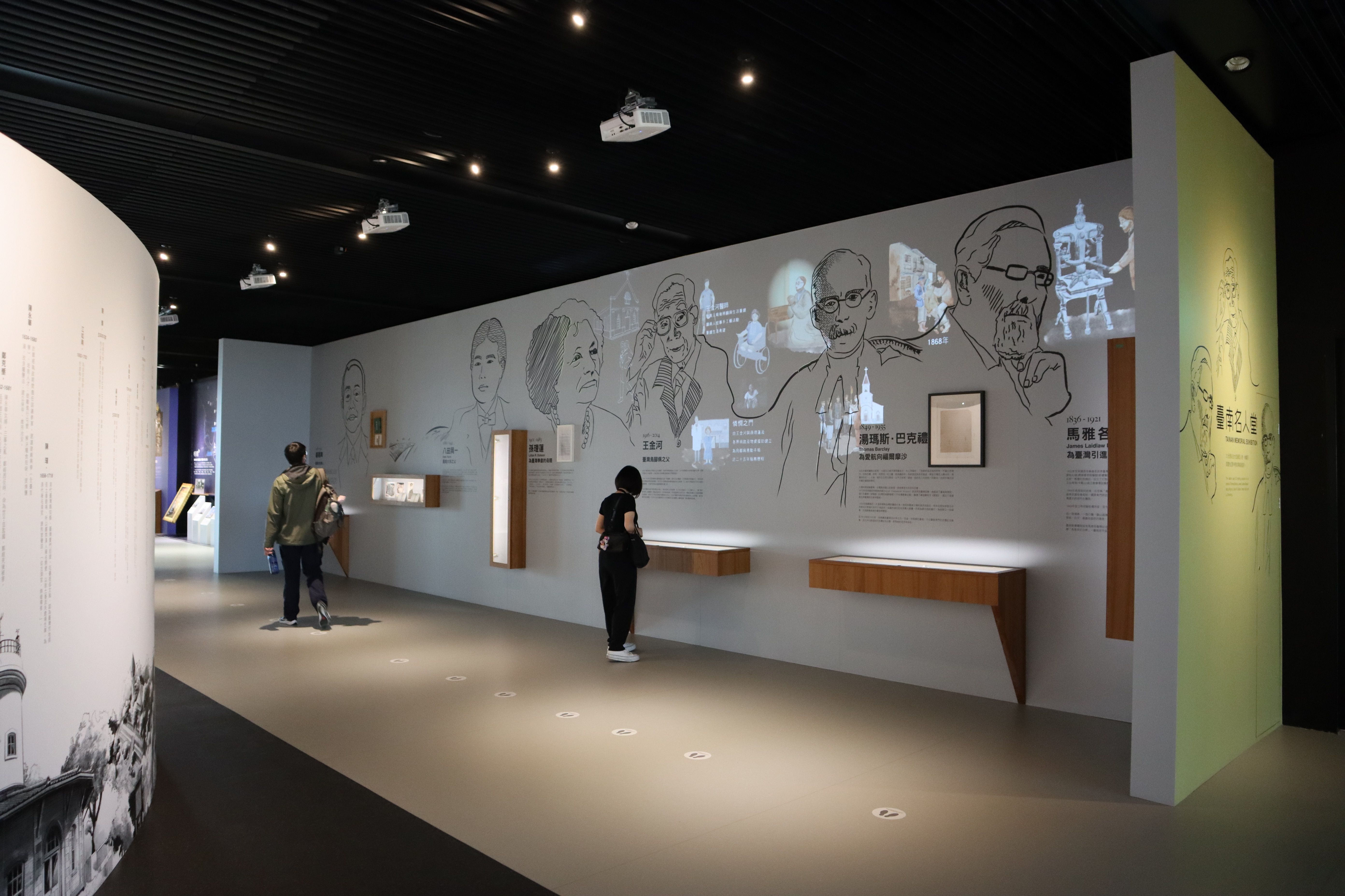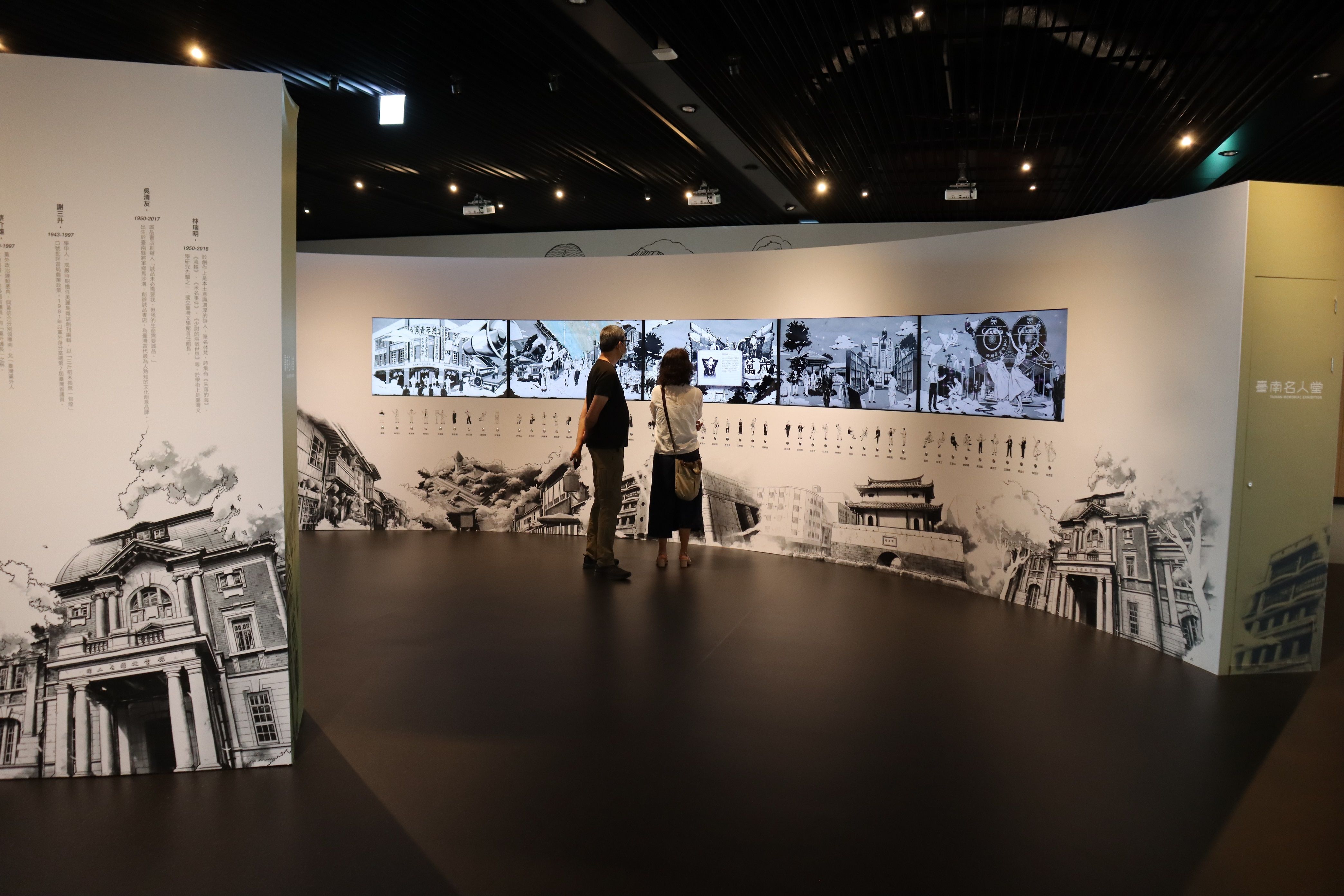 曲面動畫牆透過觸碰按鈕可深入了解名人生平「臺南名人堂」展覽為了吸引民眾駐足、尤其讓年輕的朋友感受觀賞樂趣,除了大量採用多媒體互動方式,名人故事的繪圖也由多位新生代插畫家執筆,包括以黑白線條描繪台灣文史題材聞名的「Nuomi諾米」、擅長以速寫及色彩暈染捕捉街景的臺南在地創作者「1/2藝術蝦」、以及畫風用色溫暖人心的「鄭雅文Claire」;不同的繪畫風格,豐富了觀者的想像世界,也增添了展覽的藝術氛圍。