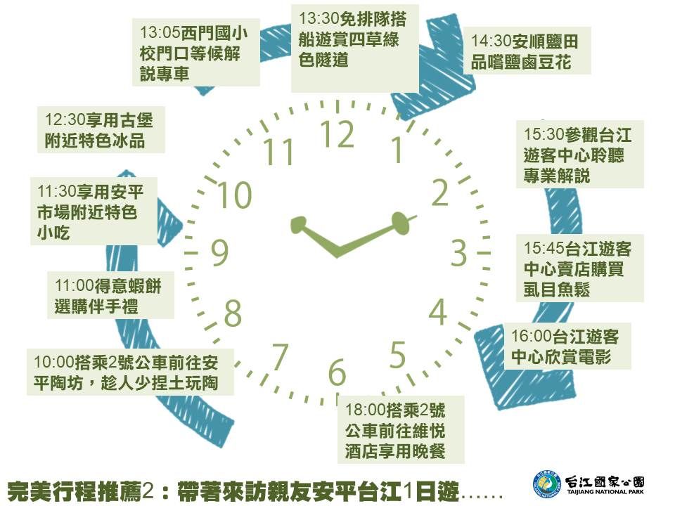 「來趣台江Fun Tour」現正運行結合自然生態與產業文化的紅樹林線,專人專車帶領遊客前往四草大眾廟,免排隊即可搭船遊賞綠色隧道,再前往安順鹽場,在傳統瓦盤鹽田品嘗天然日曬海鹽,以及鹽鹵製作的豆腐豆花;最後來到台江國家公園遊客中心,園內賣店也是解說專車的特約店家,購買虱目魚周邊產品時,記得出示乘車手環打9折。