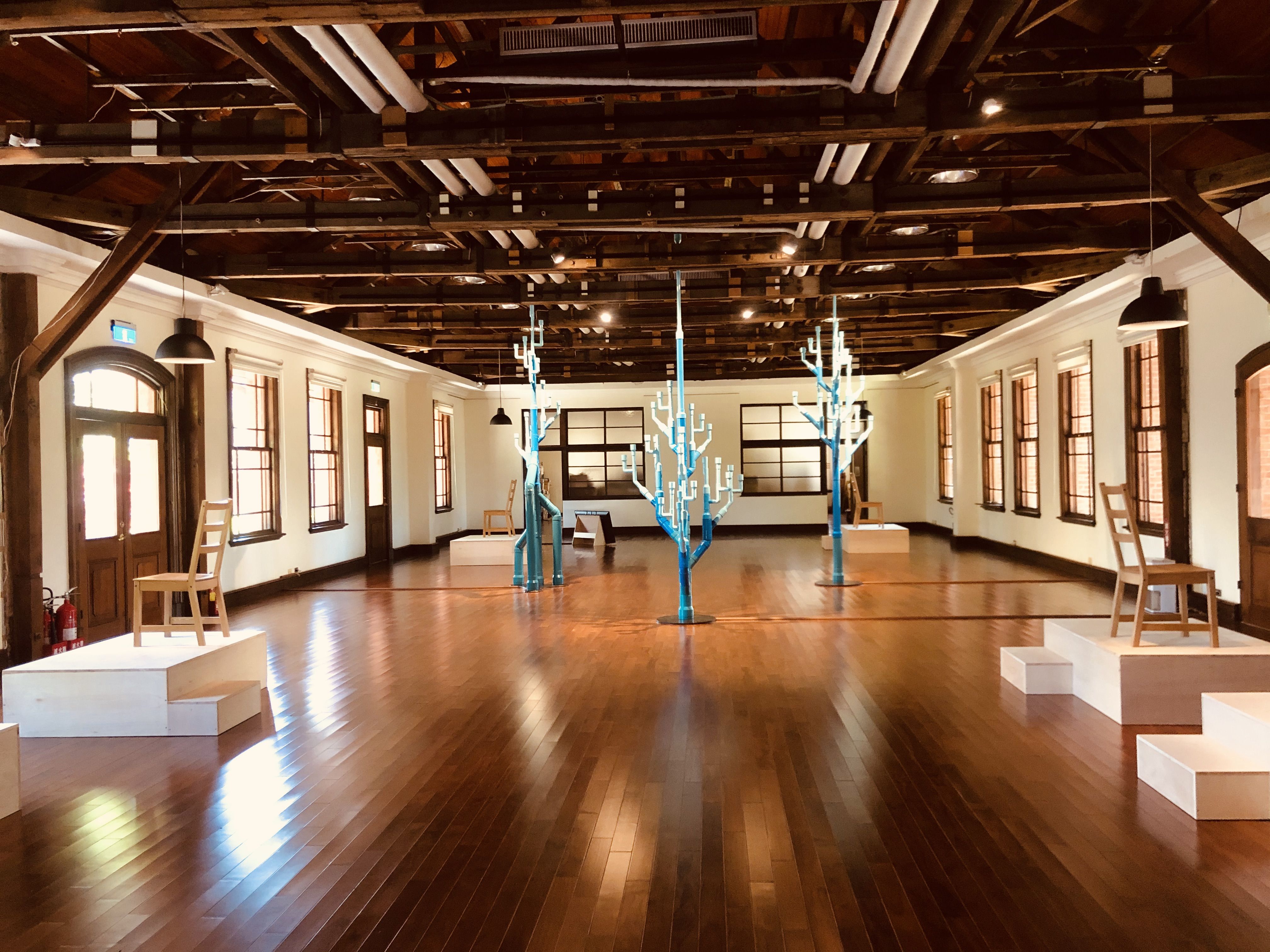 此次做為主展場的紅樓,原是明治製糖株式會社本社的辦公處所,建築內大量原檜木打造的屋樑椼架、窗框窗台,幾經多次翻修整建,仍保留原建築古樸穩重的風味。對於蔡坤霖來說,這混然天成的氣勢就是糖業歷史的呈現。他在糖業遺構中,展出3座做為象徵曾文溪溪流、烏山頭水庫、曾文水庫的水管與聲音裝置,並選五扇窗做為攔砂壩陶土作品的展台,當觀眾在觀賞陶土雕塑延伸的窗外視角,恰巧融合百年後糖廠遺構的窗外景緻。攔砂壩陶藝作品原材取自烏山頭水庫淤泥煉土燒製,創作形體源自於人造水利設施的水庫獨立構件。