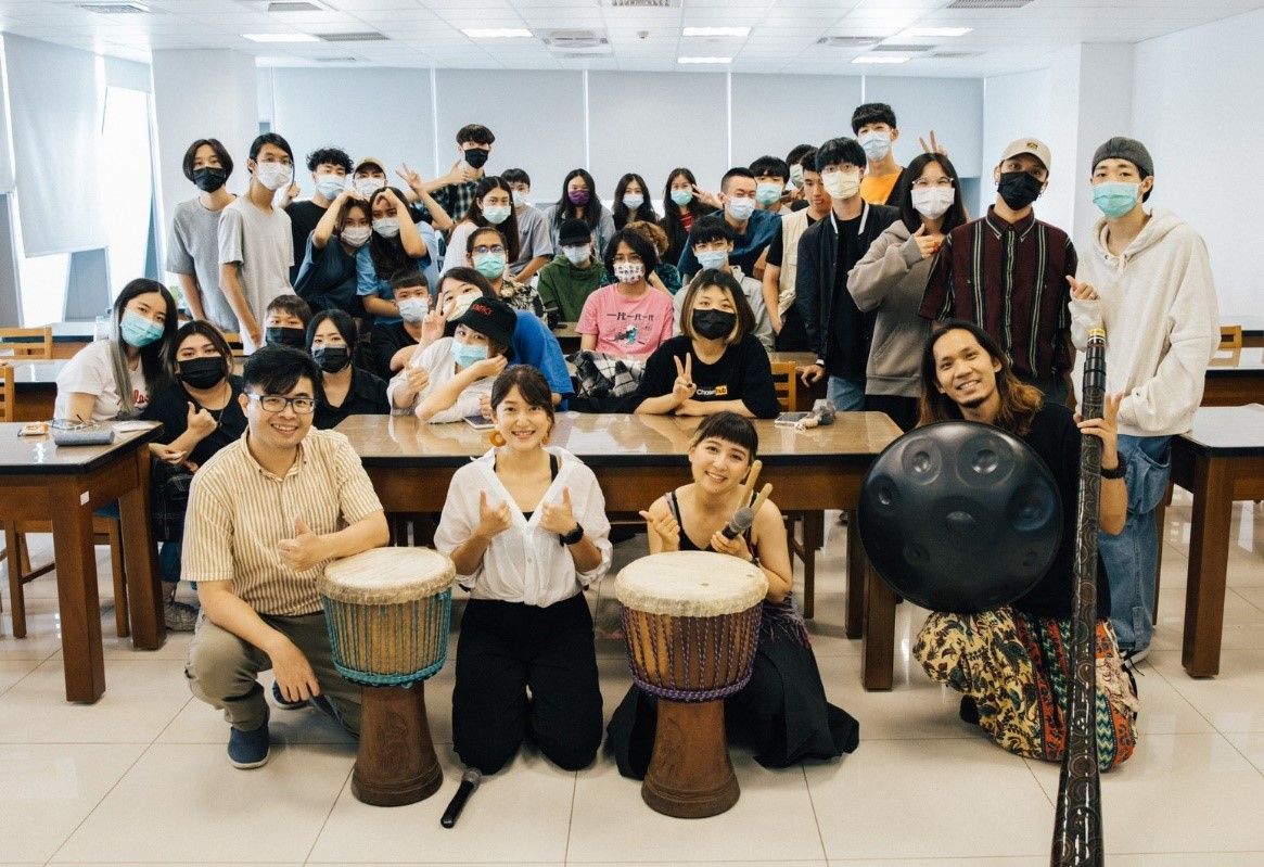 ▲ 南臺科大莊承翃老師與「音樂風格與節奏應用」學生及業師4月份於課堂中大合照