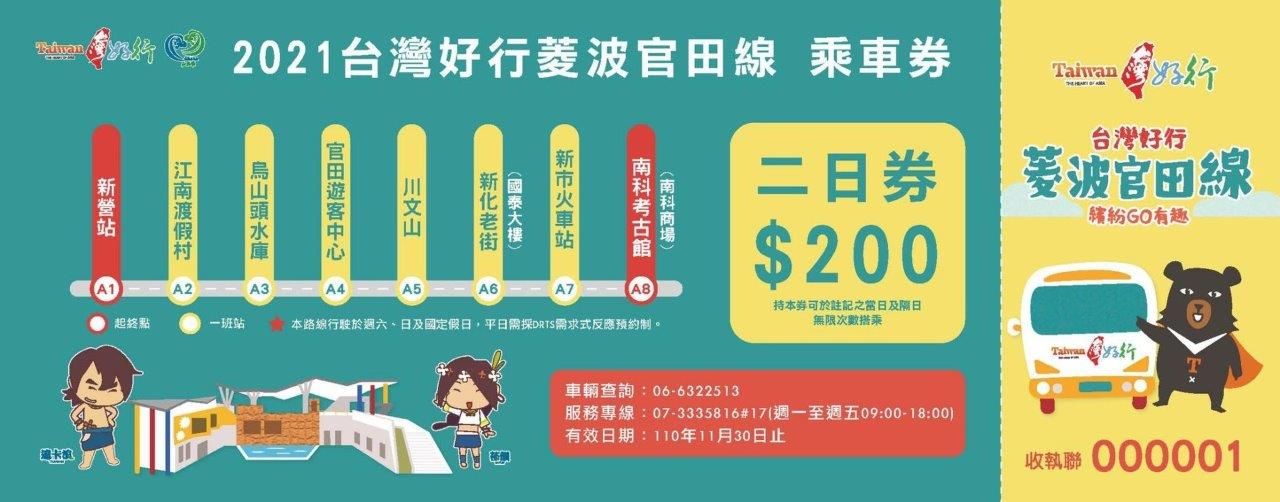 「台灣好行-菱波官田線」於每週六、日及國定假日行駛,每日往返共六班次,除此之外民眾平日還能線上預約需求反應式公車服務系統(DRTS),滿15人即可成團,讓你不開車也能出遊。套票販售實體通路有統一超商ibon、新營客運,以及易遊網、可樂旅遊、旅遊達人網、I-Want愛玩網等線上通路(詳情請見台灣好行官方網站)。為慶祝「台灣好行-菱波官田線」通車,自110年9月4日至110年9月26日開行期間,不管你是在官田遊客中心上車或是在官田遊客中心下車,此段車程通通免費,邀請民眾一同搭乘「台灣好行-菱波官田線」,來趟全新的台南公車之旅。