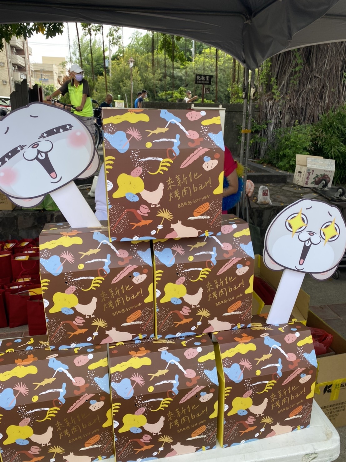 新化區長吳金喜指出,為了滿足中秋烤肉品嚐台南美食的需求,特別邀集新化在地及大台南名店,包含葉陶楊坊、東成醬油、瓜瓜園、錦霞樓、島嶼樸食、之堡、秘氏咖啡、四四拍唱片行及台南正虱目魚等合作開發「來新化烤肉Bar」烤肉禮盒,內容包含蒜味豬五花、咖哩小戰斧、義式香料雞胸肉、手打豬肉漢堡排、台南虱目魚肚、帕里尼、秘氏咖啡等各式美食一次打包到家,讓全國朋友中秋佳節不出門也能享受台南美食饗宴。