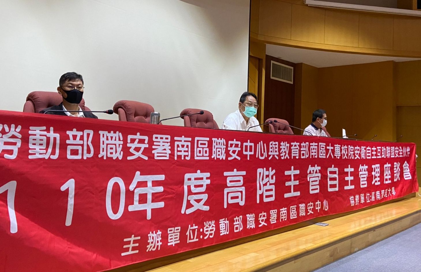 【台南訊】為落實黃偉哲市長打造「職安城市」的願景,南市勞工局10月22日上午於嘉藥學校財團法人嘉南藥理大學國際會議廳,協助辦理「勞動部職業安全衛生署南區職業安全衛生中心與教育部南區大專校院安衛自主互助聯盟締結安全伙伴關係計畫」高階主管自主管理座談會,會中由職安署南區職業安全衛生中心資深檢查員黃水添及科長吳俊傑擔任講師,並由主任許峯源擔任綜合座談主持人,以增進校園安全衛生專業知能及自主管理能力,同時促進職安扎根,培養未來工作者的職場安全意識。