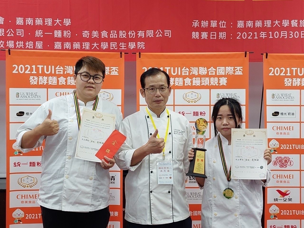 嘉南藥理大學餐旅管理系10月30日與美國小麥協會、統清股份有限公司、統一麵粉、美食品股份有限公司及愛奶客烘焙屋,聯合舉辦「2021 TUI台灣聯合國際盃發酵麵食饅頭競賽」,吸引全國大專校院、高中職校及業界各方好手同場競技,經過激烈初賽後,15隊進入總決賽,最後由嘉藥餐旅系李婉瑜及育德工家蔡佩君這對拍檔拿下金牌,以多元華麗創意為麵食創新寫下新頁。
