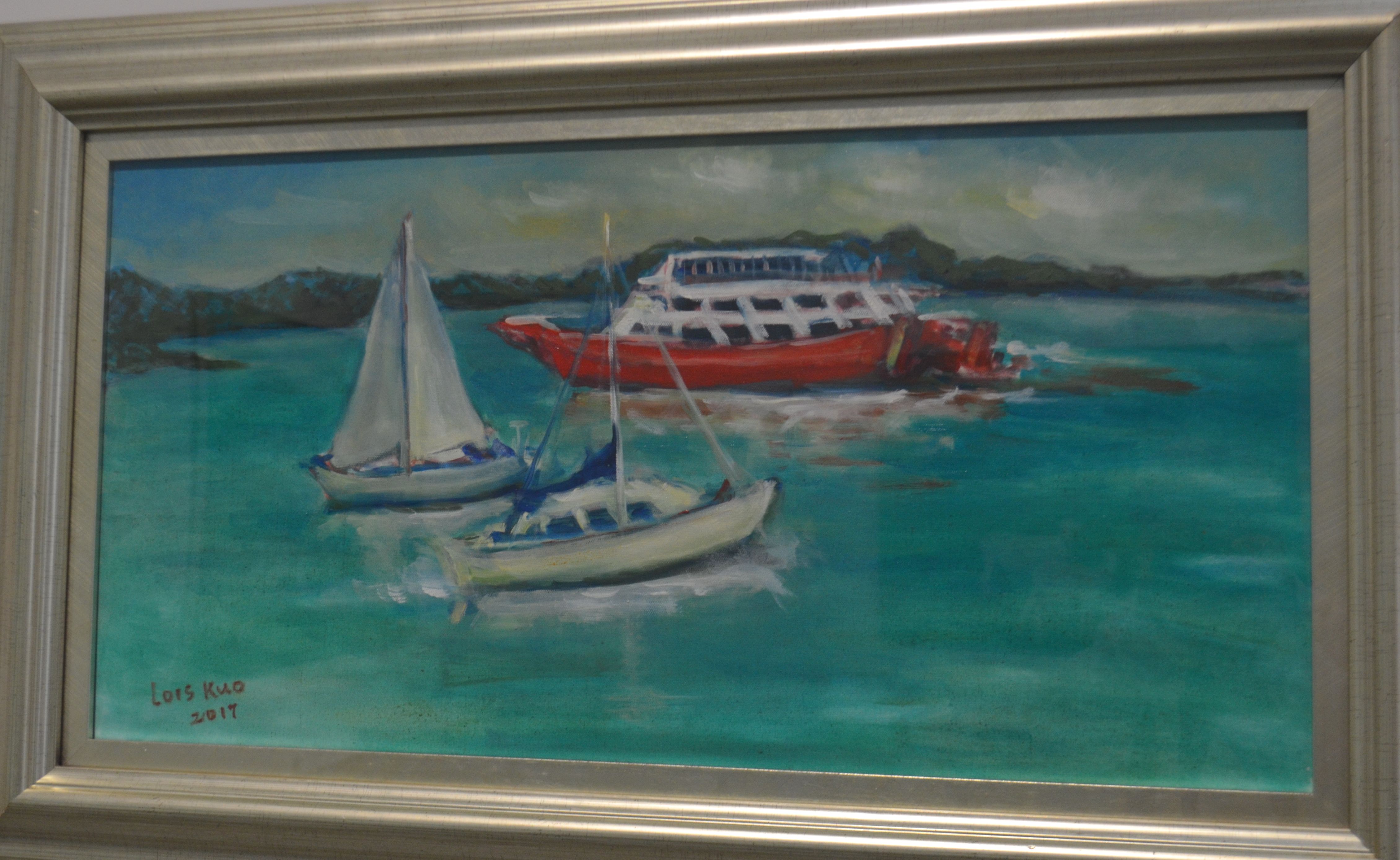 風景畫部分有近期於臺灣南端及東部遊歷時所見的壯闊山景,和退休後旅居紐西蘭期間的港邊風光,兩者互相映照,從畫面整體色調呈現藝術家不同