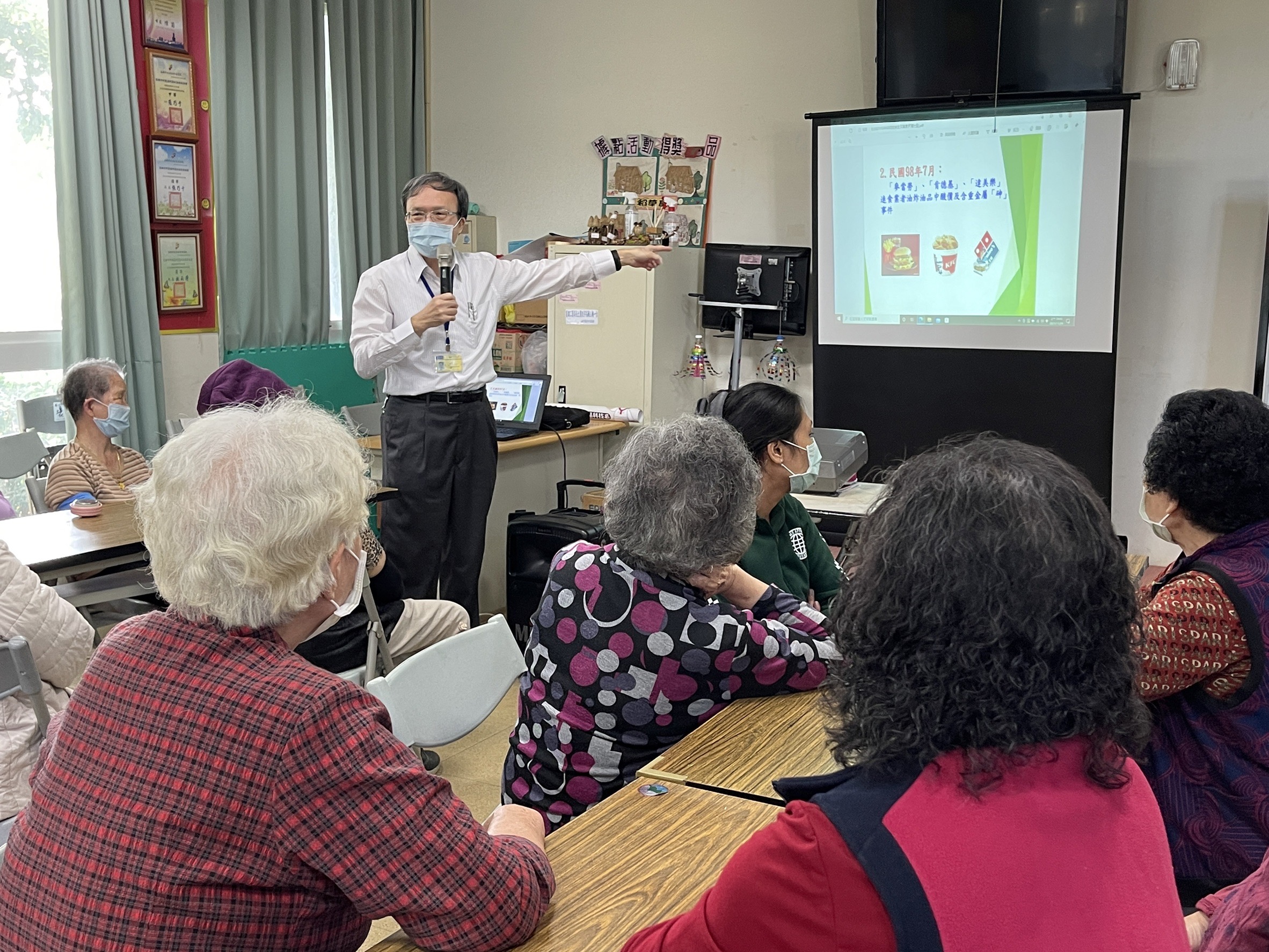 嘉藥高福系兼生科系范晉嘉教授,今日在阿蓮社區為長者介紹食品安全,以「吃的安全又健康」為講解的主軸,介紹過去國內外食品安全案例(如三聚氰胺、起雲劑、地溝油、戴奧辛等),讓社區長者了解食品安全。以簡單且日常生活中常見的食品來介紹(以豆製品為例),讓來參加的學員能用簡單且易吸收的方式,來知道食品安全的重要,希望大家能吃的安全也用的安全。