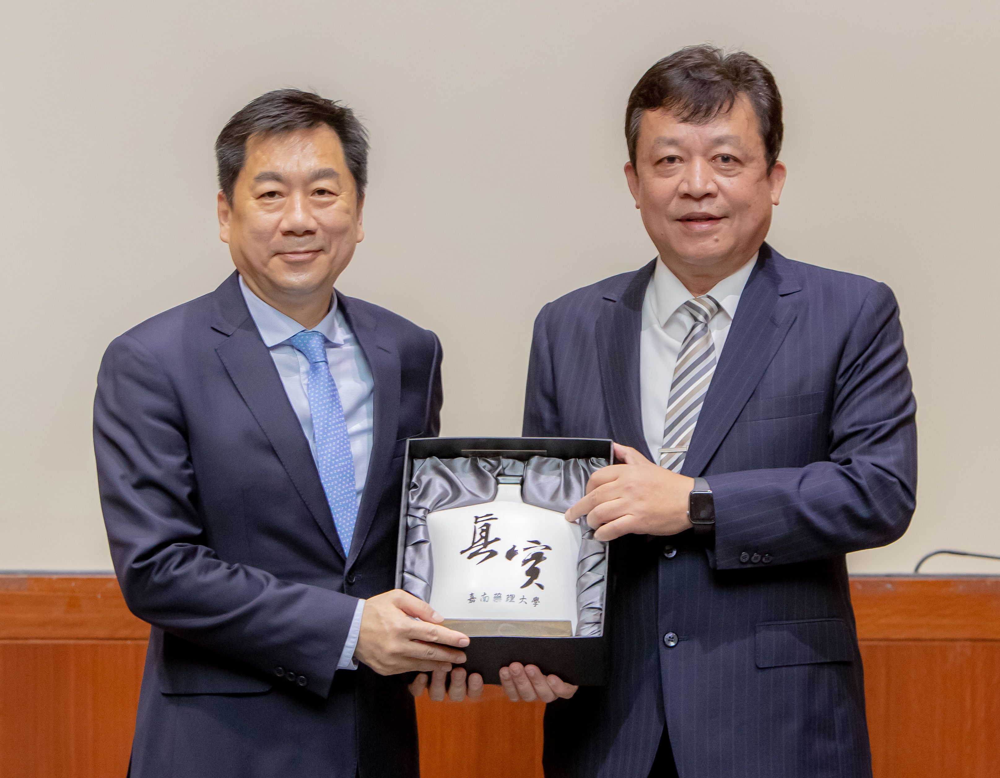 嘉藥校長李孫榮特別致贈以嘉藥校訓「真實」為題之白瓷酒瓶,除了感謝陳政次應邀蒞校演講外,也傳達對陳政次與中央疫情指揮中心長期守護台灣的敬佩,李校長表示,新冠疫情影響全民生活甚巨,還好有中央疫情指揮中心明確而有效的指引,引導民眾及學校在抉擇當下做出正確措施,如今大家能相聚於校園,齊聚一起聆聽演講就是台灣疫情控制成功的最佳證明,也是政府、防疫人員與民眾共同努力的成果。