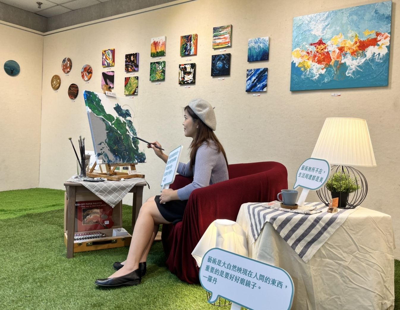 本次展出主題為「藝・生活」,希望表達出花苼米推廣藝術教育的初衷與目標:讓藝術能貼近日常,貫徹藝術就是生活、生活就是藝術!此次展場分成三個展區:「生活的風景」、「家的溫馨角落」、「夢與夢想」