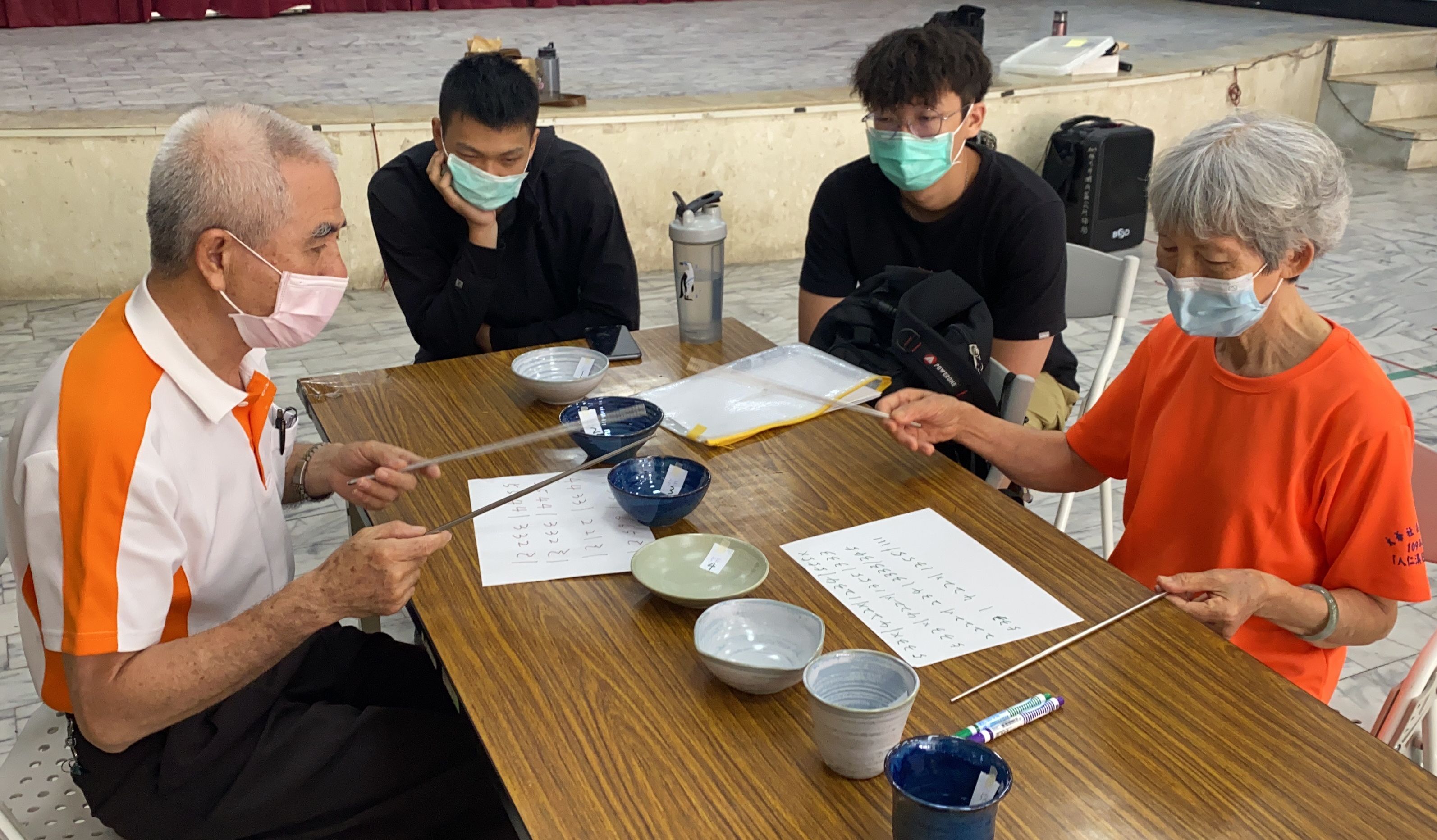 ▲ 嘉藥學生進入社區教導長輩使用陶瓷樂器敲打出優美樂章