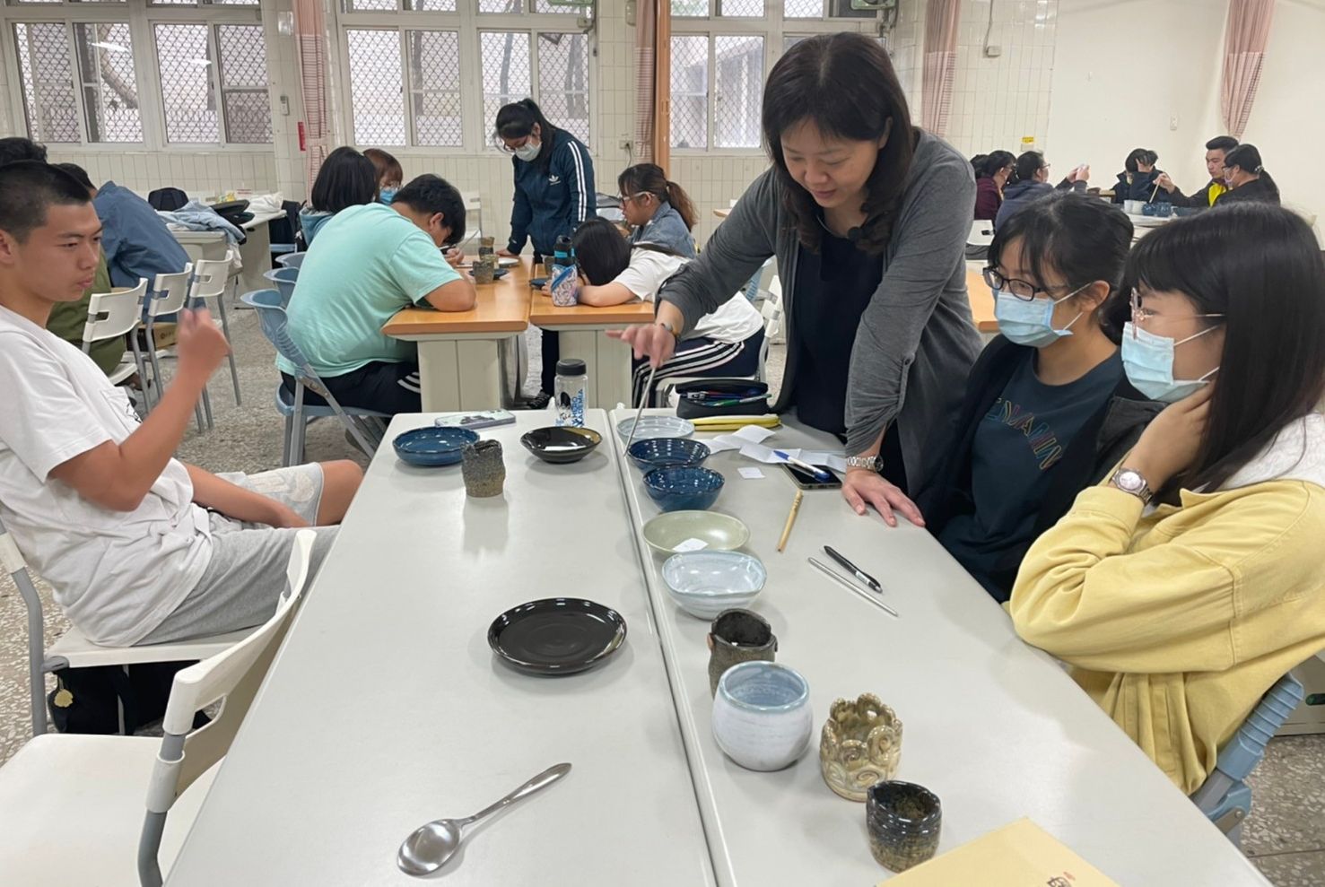 ▲ 嘉藥高福系陳如萍老師教導學生透過陶瓷樂器敲打出優美聲音