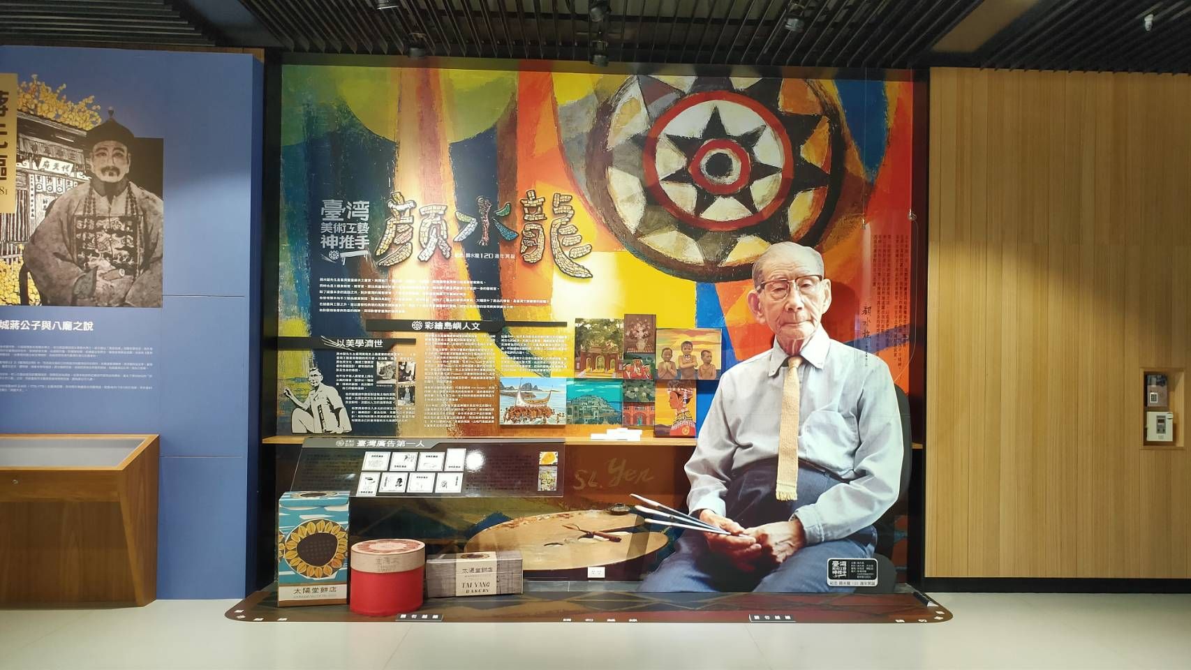 》以及臺北日新大戲院的《旭日東昇》在內,一生中共完成了17幅馬賽克壁畫,在臺灣公共空間的景觀美化上留下鮮豔的成就。展牆A面便由馬賽克鑲嵌作為佈景主題,以文字搭配相關作品,介紹顏水龍在馬賽克鑲嵌與臺灣工藝教育上的付出;牆上並設有生平年表,讓觀者瞭解顏水龍一生重要經歷。