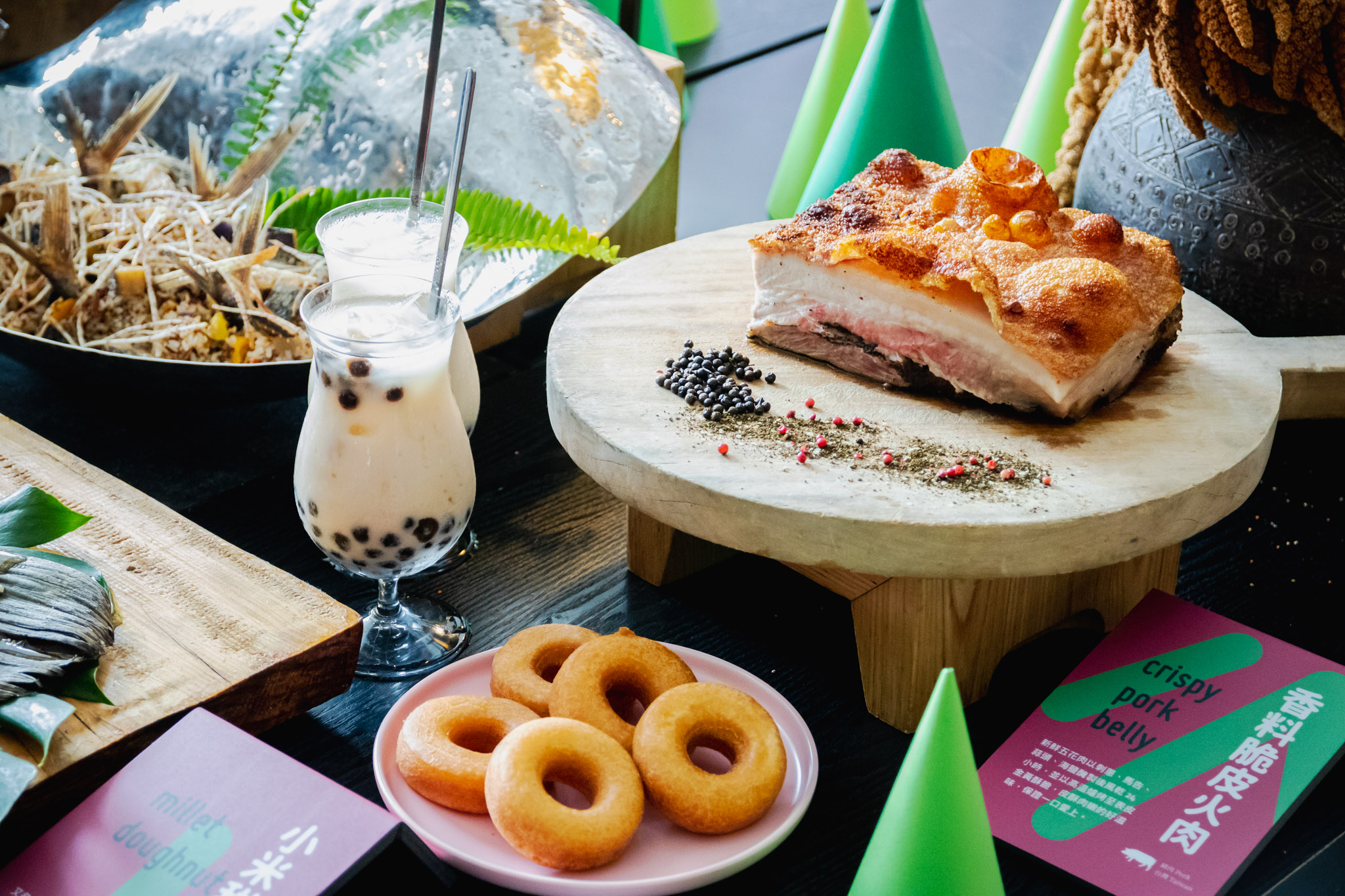美味必嚐焦點包含採用原住民重要日常食用野菜──假酸漿葉,包裹黃澄小米的「阿拜」,入口咀嚼感受兼富營養與飽足感的天然美味;「香料脆皮火肉」上選新鮮五花肉,佐以刺蔥、馬告、蒜頭、海鹽醃製後風乾24小時,再以高溫爐烤至表皮金黃酥脆,迸發皮酥肉嫩的誘人風味;「黑豬肉香腸」嚴選Q彈精實黑豬腿肉,佐以原民朋友分享的傳家配料自然醃製12小時以上,後採二分肥、八分瘦比例手工充填,搭配碳烤蕗蕎,縈繞出飽滿肉香的狂野鮮味;不容錯過的佐餐飲品「小米酒珍奶」,更是融合台式手搖飲調製概念,提供饕客依個人喜好自行調製,創意激盪原味與台味的微醺美味,更享DIY樂趣無限!