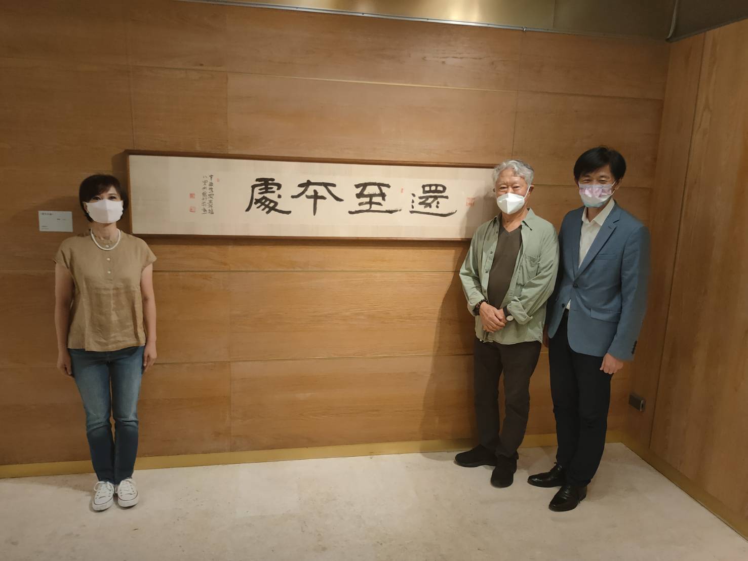 ▲葉澤山局長(右一)、蔣勳老師(右二)、李怡寧董事長(左)在「還至本處」書法前合影
