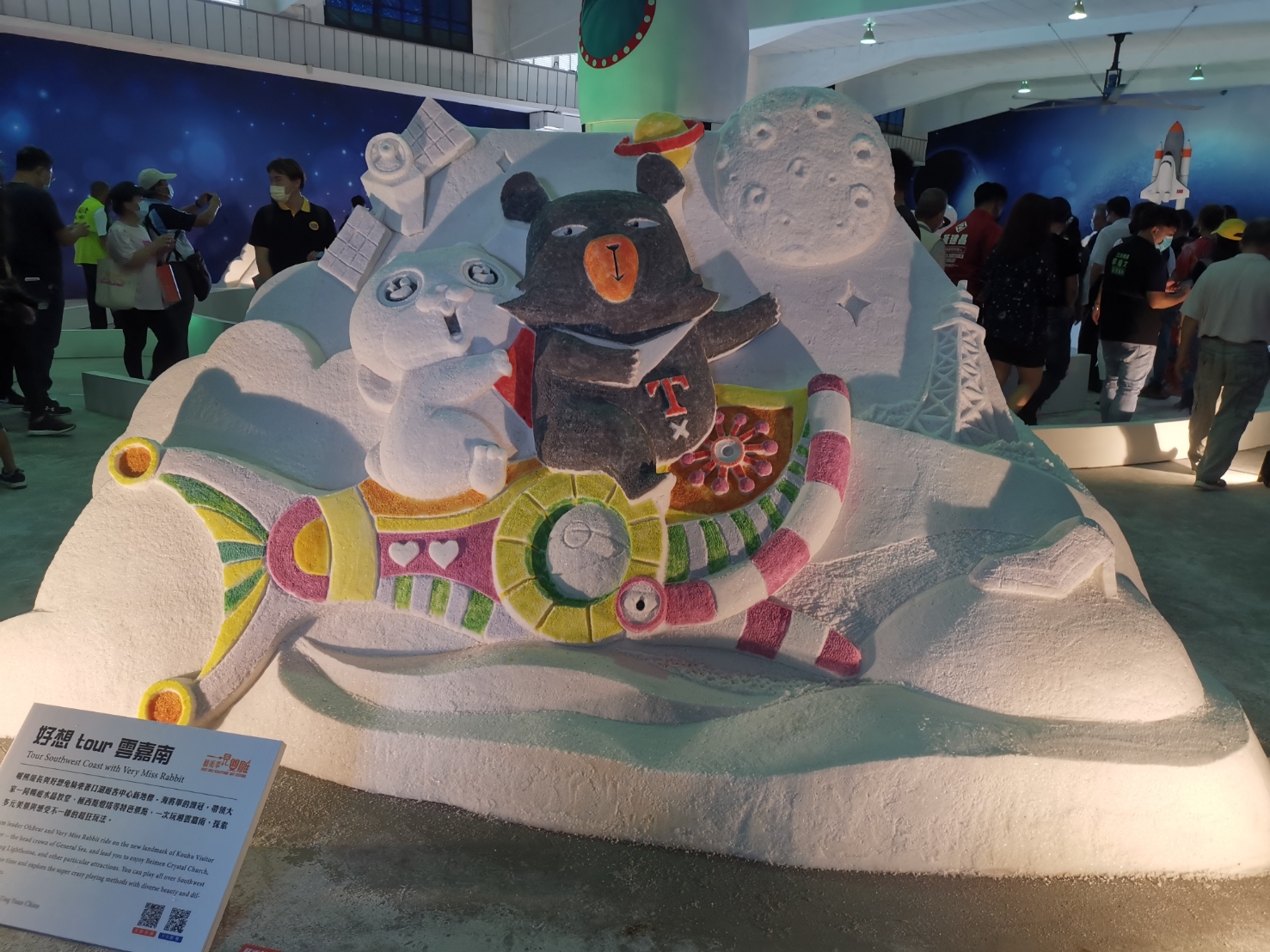 貴賓參觀鹽雕作品2日的開幕活動以七股鹽山為主場,由觀光局副局長周廷彰、雲嘉南管理處陳煜川處長、臺鹽公司副總經理李杰翰等貴賓聯合進行開幕儀式。七股鹽山鹽雕-「鹽宇宙」結合文創「好想兔」與宇宙等元素,並搭配雲嘉南特色景點及在地生態等,創作12座創意鹽雕作品。除了打造宇宙主題場景,並首次與貼圖常勝軍-好想兔合作,為作品增添年輕、活潑的元素,注入文創新風潮。晚間另於臺灣現存最古老的井仔腳瓦盤鹽田展演光雕地景藝術,藉由光雕絢麗的視覺藝術,與鹽田夕陽美景相輝映,讓悠久歷史的鹽田展現新的光彩。