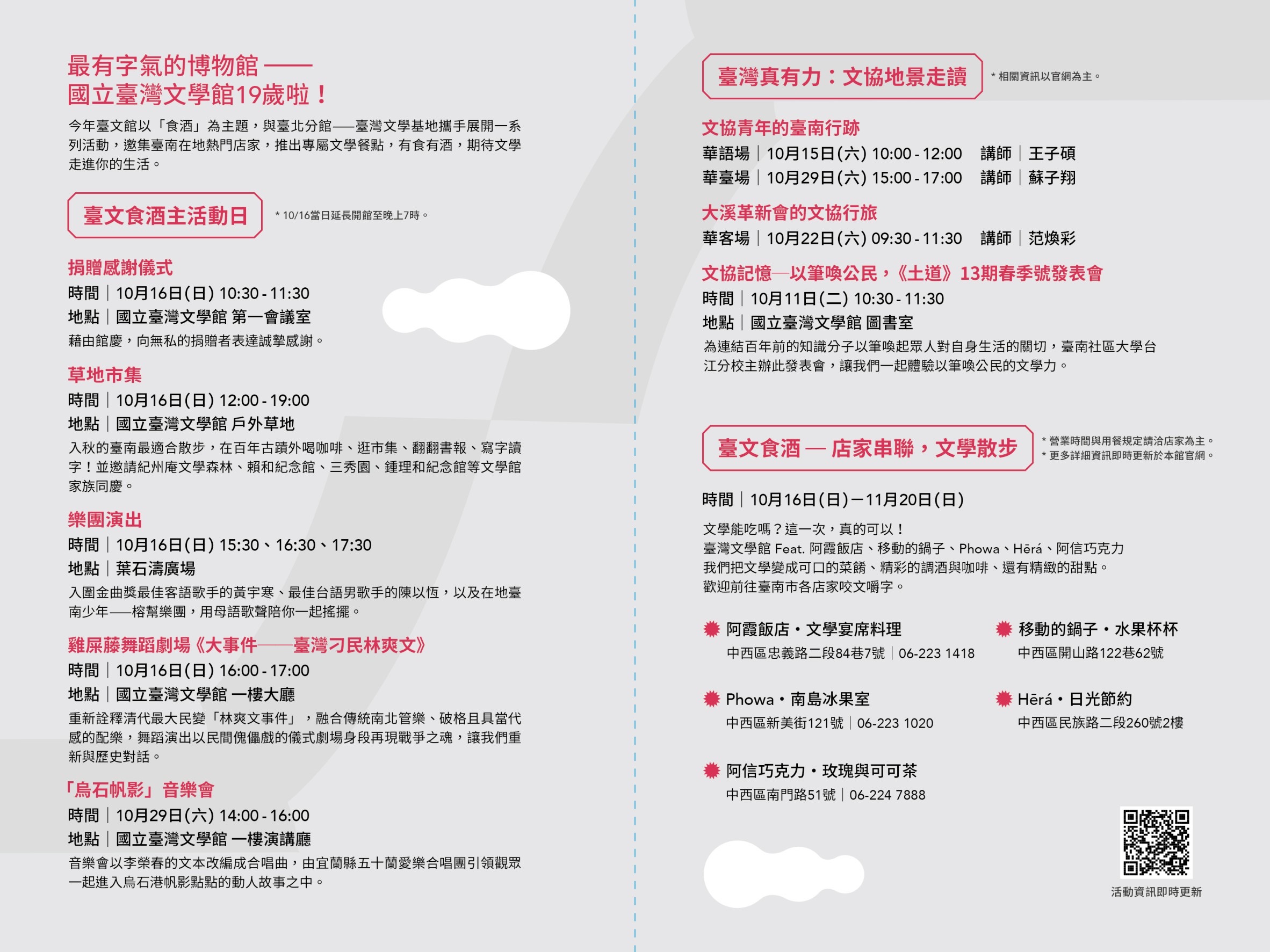 10月15日至16日於臺灣文學基地,有華語、緬甸語兩場親子說故事活動;由韓良憶、周聖凱分別領隊的兩場走讀,體驗飲食生活、走訪社運地景;還有最有紙氣的手作體驗——迷你手抄紙扇、浮水畫明信片;食酒市集除了邀集文創、輕食攤位,亦有文學館家族——三毛清泉故居、李榮春文學館、龍瑛宗文學館、紀州庵文學森林共襄盛舉!