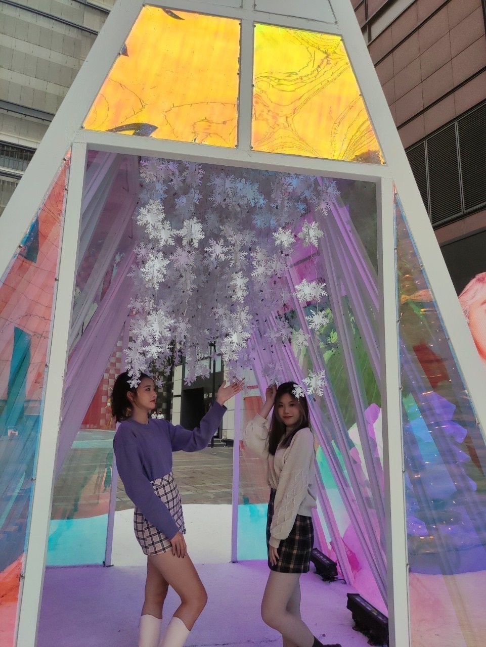 新光三越台南新天地彩虹玻璃屋絢麗的彩虹玻璃屋也不能錯過!透明的玻璃小屋裡掛滿白色雪花燈飾,以彩虹元素玻璃折射出美麗的光影變化!每日17:00-22:00整點還有「耶誕城雪花燈光秀」表演,精彩繽紛的燈光投影,讓整個燈海遍布雪國照亮整片雪地,再搭配耶誕鐘聲響起,南台灣最美耶誕樹就在台南新天地!