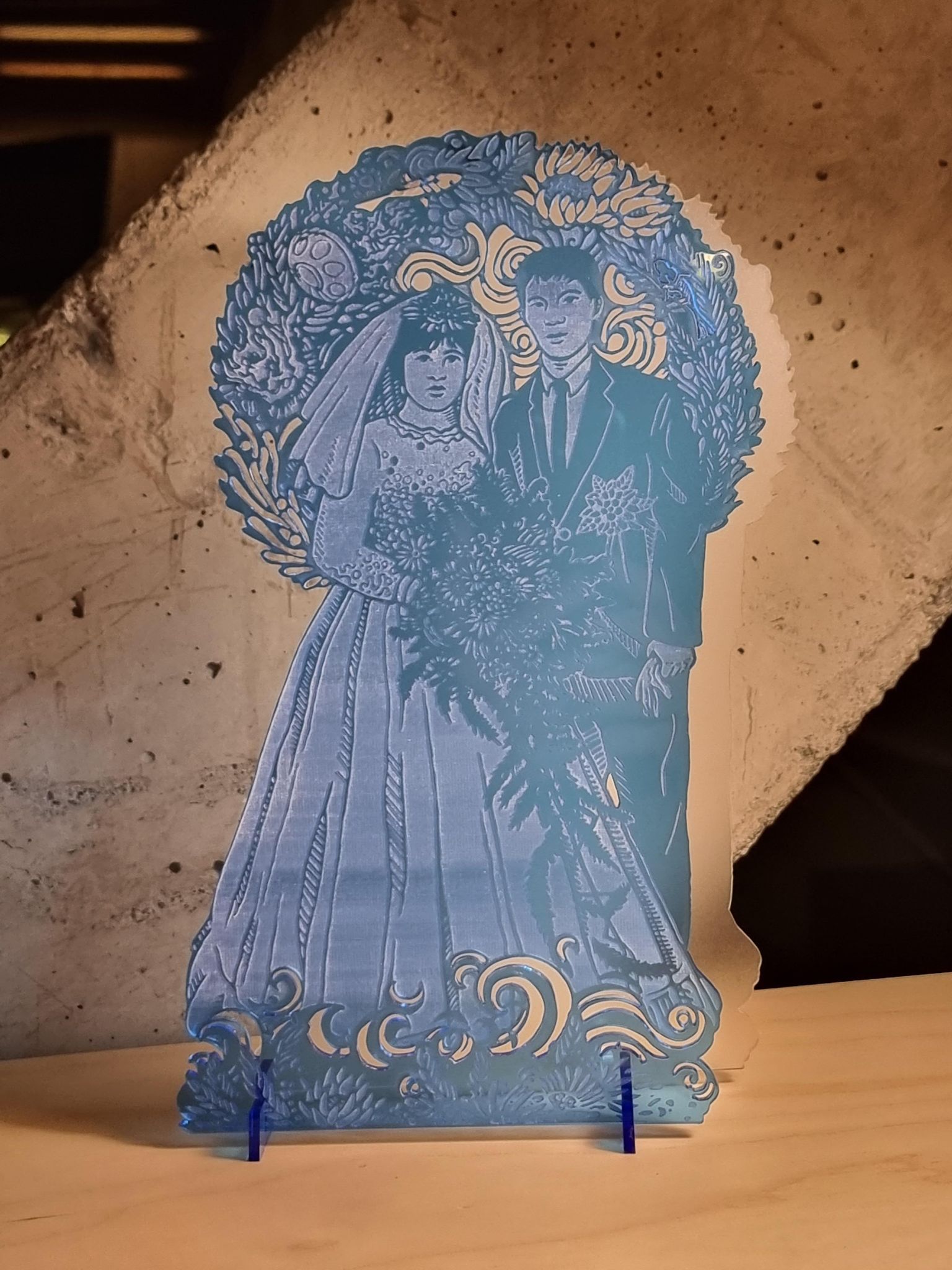 ▲ 曾惠青老師以父母結婚照為「天使」發想來源的雷雕作品