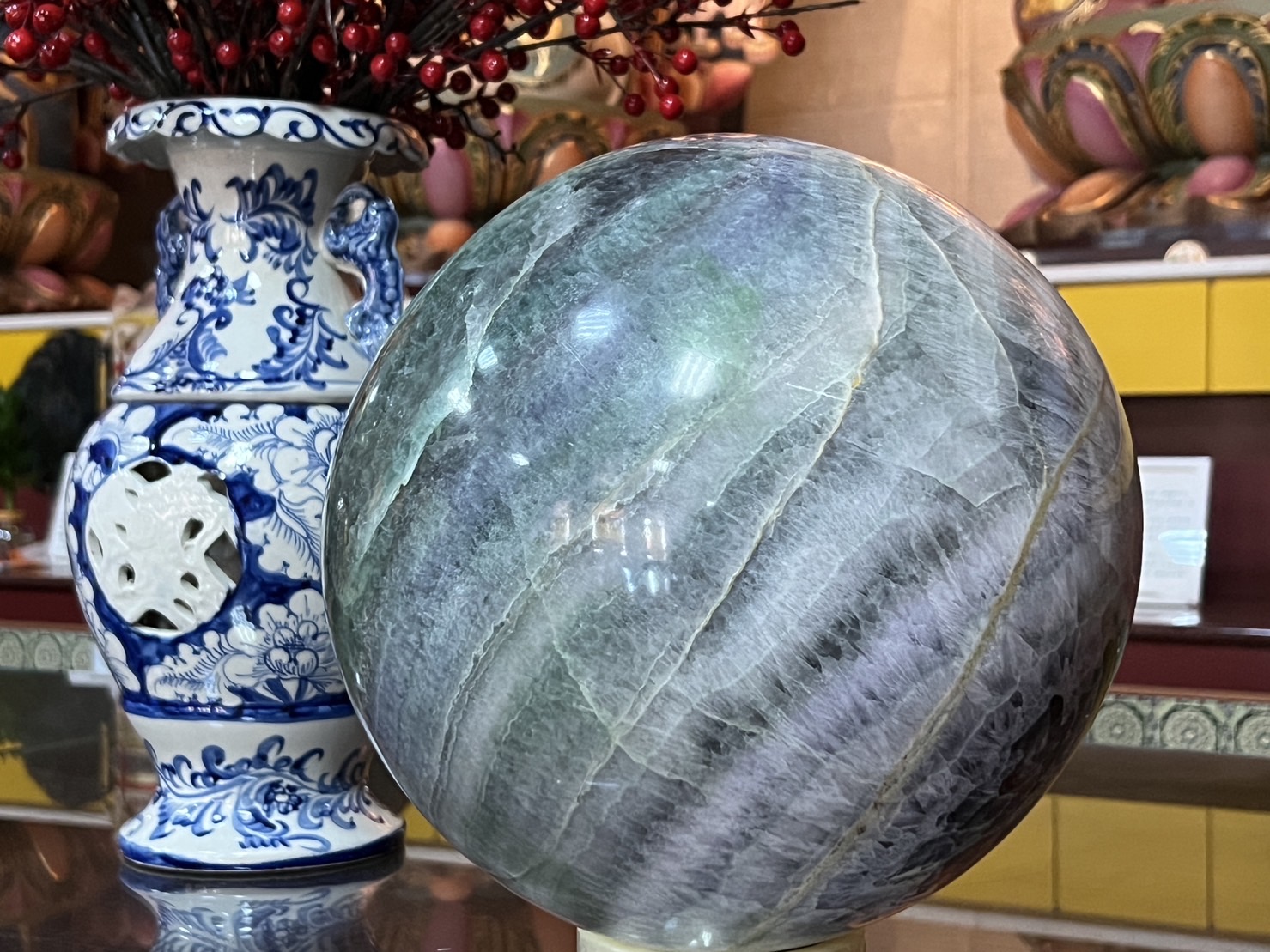 財團法人貢噶寺董事長李明威表示,新春期間歡迎民眾至貢噶寺走春求財,「顯密文化會館」常設展除展示藏傳佛教大藏經、圖書、貝葉經、唐卡等文物,此次新春春期間特別安排「磊明珠特展」,展示的螢石由盧寶禎居士捐贈,非常感謝盧寶禎居士的善心,現場也提供螢石義賣,義賣所得將作為公益慈善及建寺修繕之用。盧寶禎居士表示,螢石乃智慧之石,經除障去邪及財神加持後,可放家中財位,而螢石球狀代表圓滿,讓您福祐一整年。