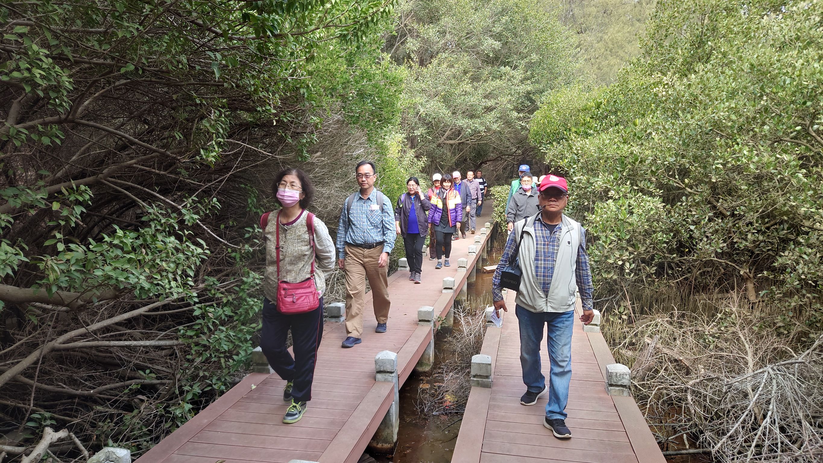 一行人由該會候補理事陳金華老師全程進行精闢的導覽解說,大家進一步認識「雙春濱海遊憩區」,此區遍植紅樹林,走在密植有水筆仔、紅海欖、海茄冬、欖李、土沉香圍繞於四周的舒適安全的步道,是認識海邊紅樹林很優質的學習之旅。