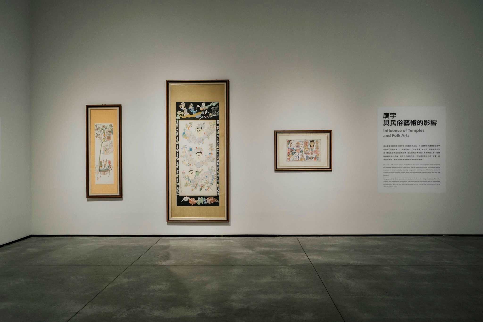 ▲ 洪通展區以臺南市政府典藏極其珍貴的30件作品為選件基礎,以風格分類為「廟宇與民俗藝術的影響」、「歡快的土地之夢」、「文字畫、畫文字」三區。