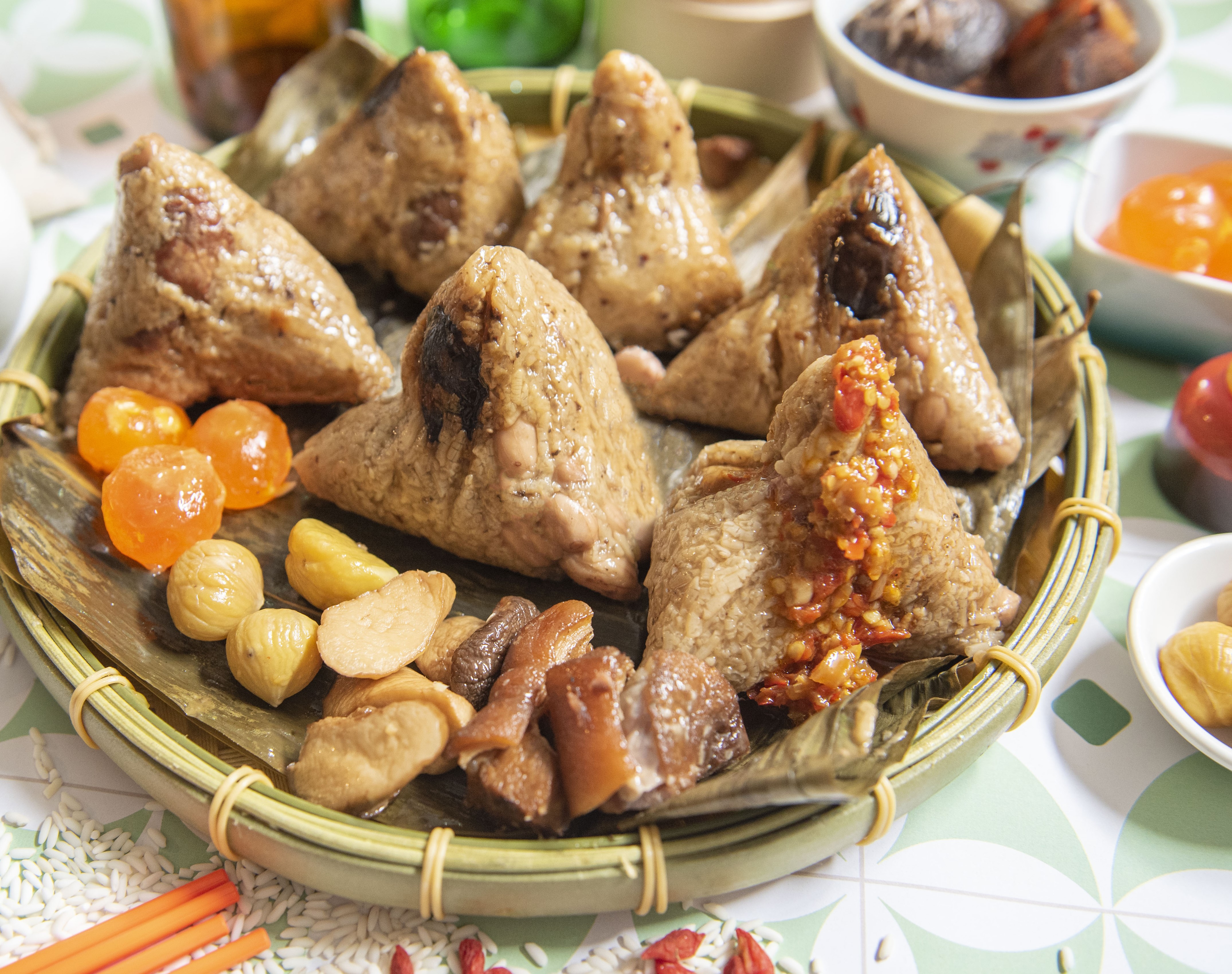 經典府城粽採用南部最道地的工法製作,用料實在、鹹香入味;栗香豬腳粽使用紮實的豬前蹄,鮮嫩的口感與肉汁融在嘴中,口齒留香的難忘好滋味;香辣剁椒粽則搭配上飯店最暢銷的主廚秘製剁椒醬,口感豐富、香濃不辣嘴!如果想要養生與美味兼具,還可以選擇蔬食者最愛『麻香鮑菇藜麥粽』,營養的紅藜麥搭配糯米,包入香醇麻油拌炒的杏鮑菇、雪蓮子、枸杞等養生配料,每一口都吃的養生又健康,另外還有小雪蓮肉粽與經典花生粽,小巧而豐富,健康好選擇!除了溫馨小資的628元『粽樂禮盒』與精緻美味的1,128元『粽意禮盒』,另還有粽饗禮盒878元、粽香禮盒798元、粽樂禮盒628元共五款禮盒任你挑選!