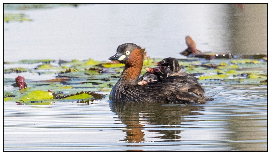 ▲ 小鸊鷉親鳥在育雛時,雛鳥揹在背上,幼鳥會躲在親鳥翅膀下,有時探出頭,模樣可愛。(照片來源:賞鳥達人 蘇佳霖老師)