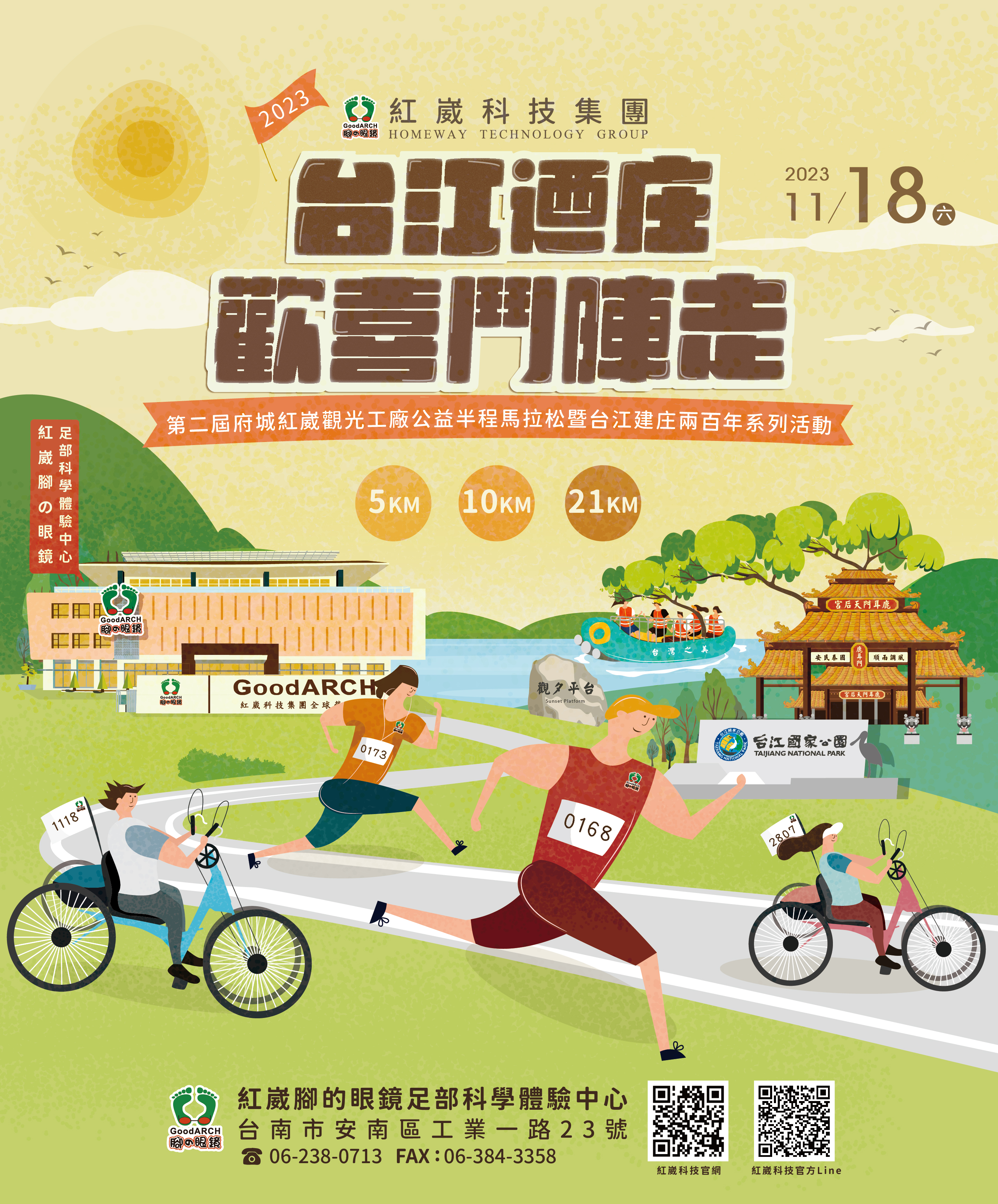 「為健康而跑,賞玩台江行」!紅崴科技睽違兩年,將於11月18日(六)再次舉辦「台江迺庄歡喜鬥陣走!2023府城-紅崴觀光工廠公益半程馬拉松」!本次規劃5公里樂活組、10公里健康組以及21公里挑戰組,並邀請「中華民國身障自行車運動發展協會」的身障奧運手搖車好手擔任賽事前導車,以響應公益,讓您自在享受安南區建庄200年,擁有豐富歷史人文與生態、新興科技與環保共榮的台江風情,同時賞玩紅崴觀光工廠、在地市集以及歡樂嘉年華,還邀請到YOYO家族的大哥哥大姊姊與現場民眾遊玩互動!歡迎您參與這場盛宴!