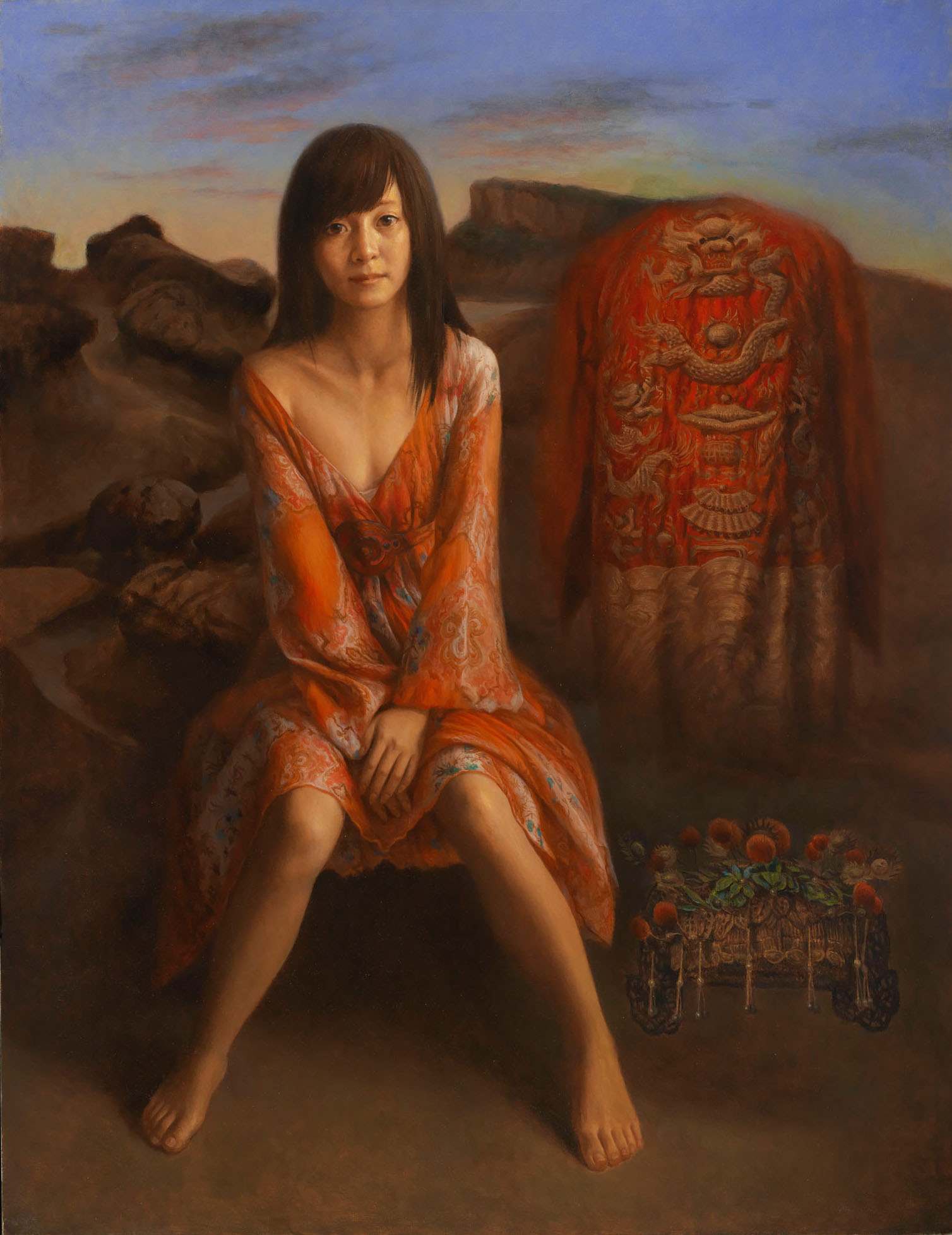 陳香伶作為女性藝術家,生命的歷程中,同時為人女、為人妻、為人母,在此展中以其油彩創作回望自己乃至全人類的故事。《女氏物語》展出陳香伶的繪畫作品,極致華麗的清朝絲綢繡片,小心翼翼細細縫製的刺繡,妝點絲綢滑順光澤的璀璨,幽暗之中兀自閃耀著光芒,顯得極度耀眼卻也孤單淒涼。該是極喜,竟變得極悲,艷麗伴隨風化的枯骨,分不清真假虛實的蝴蝶,翩翩飛舞穿梭在枯骨與刺繡假花的嬌豔中,此將女性幾近愚癡的堅忍顯現無遺,令人不忍卒睹。畫面展現出猶如花開荼糜早已消逝的過往風華,或者是畫中所見古代女性所穿戴的刺繡衣裳或婚嫁物件,借古諷今,揭露女性千百年來在父權下被壓抑甚至被物化的卑微。呼應著百轉千迴的流轉過程中,女性從附屬存在為「物」艱難尋覓而終至獲得自我的本真存在,那是女性從存在物到存在的醒覺,那是陳香伶以繪畫書寫的「女氏物語」。