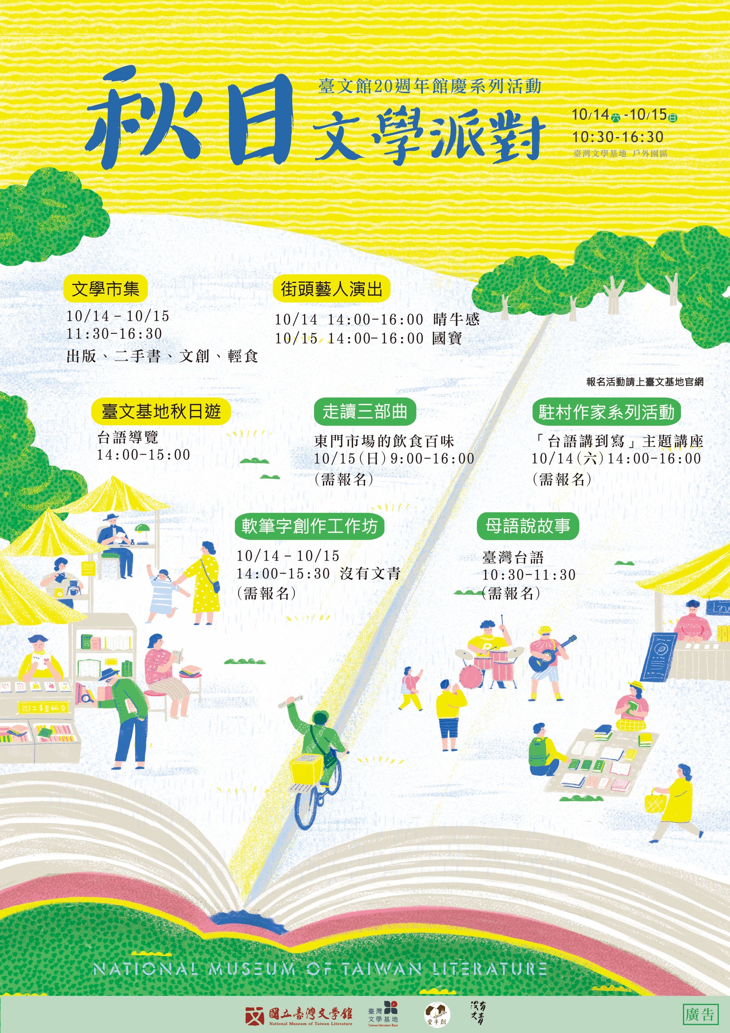 國立臺灣文學館即將在今年10月17日「臺灣文化日」迎接20歲生日,於館慶日前夕的週末於本館與臺北的臺灣文學基地攜手推出一系列活動!呼應臺灣文化協會號召大眾、走進生活的精神,臺文館於成立20年之際推出全新品牌「文學暢秋日」市集,以各種充滿意趣的形式,詮釋臺灣文學豐富的樣貌,翻轉大眾對文學的想像,邀請民眾一起秋高氣爽暢遊文學生活!Let’s Fall in Literature!