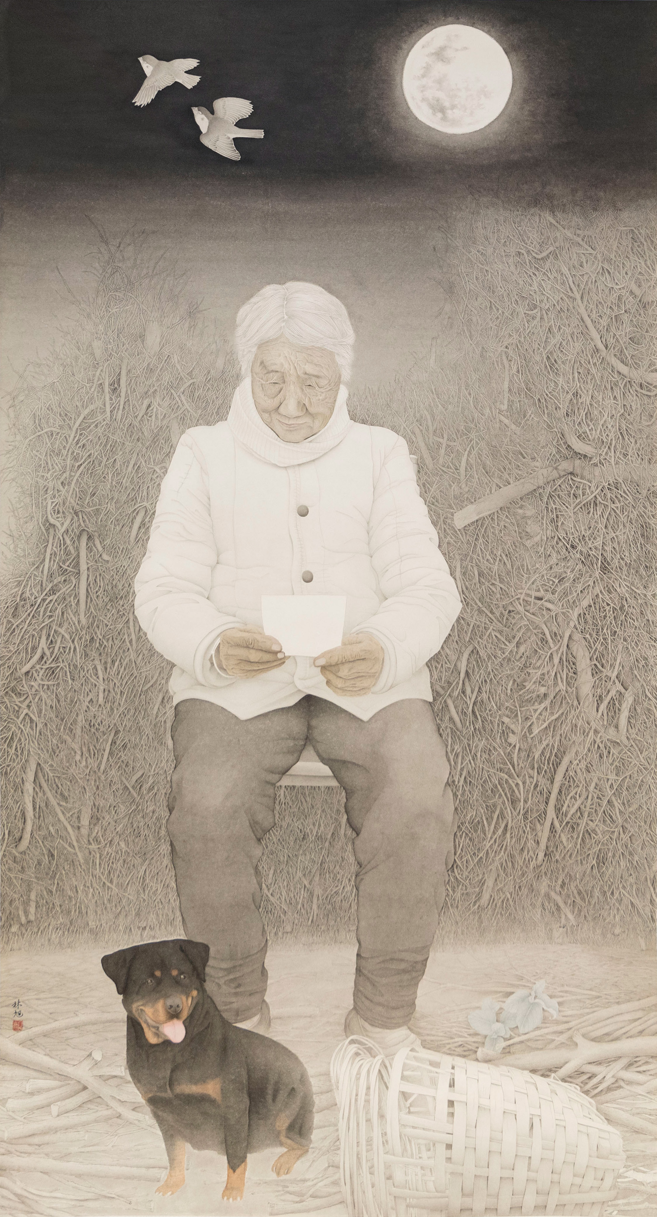 水墨類特優林旭同學的作品“微月映遠思”,整體用墨勾勒,天空用大量的墨來反覆罩染,老人與狗狗用墨染立體,再來上色,枯枝和地上的竹籃用墨染前後關係要明顯。用他純熟的水墨功底表達出雙鬢被歲月漂白,思念被時光加深,時光會老,容顏易逝,在微月下的老人看著手上的家書所思念著遠在外地的家人。