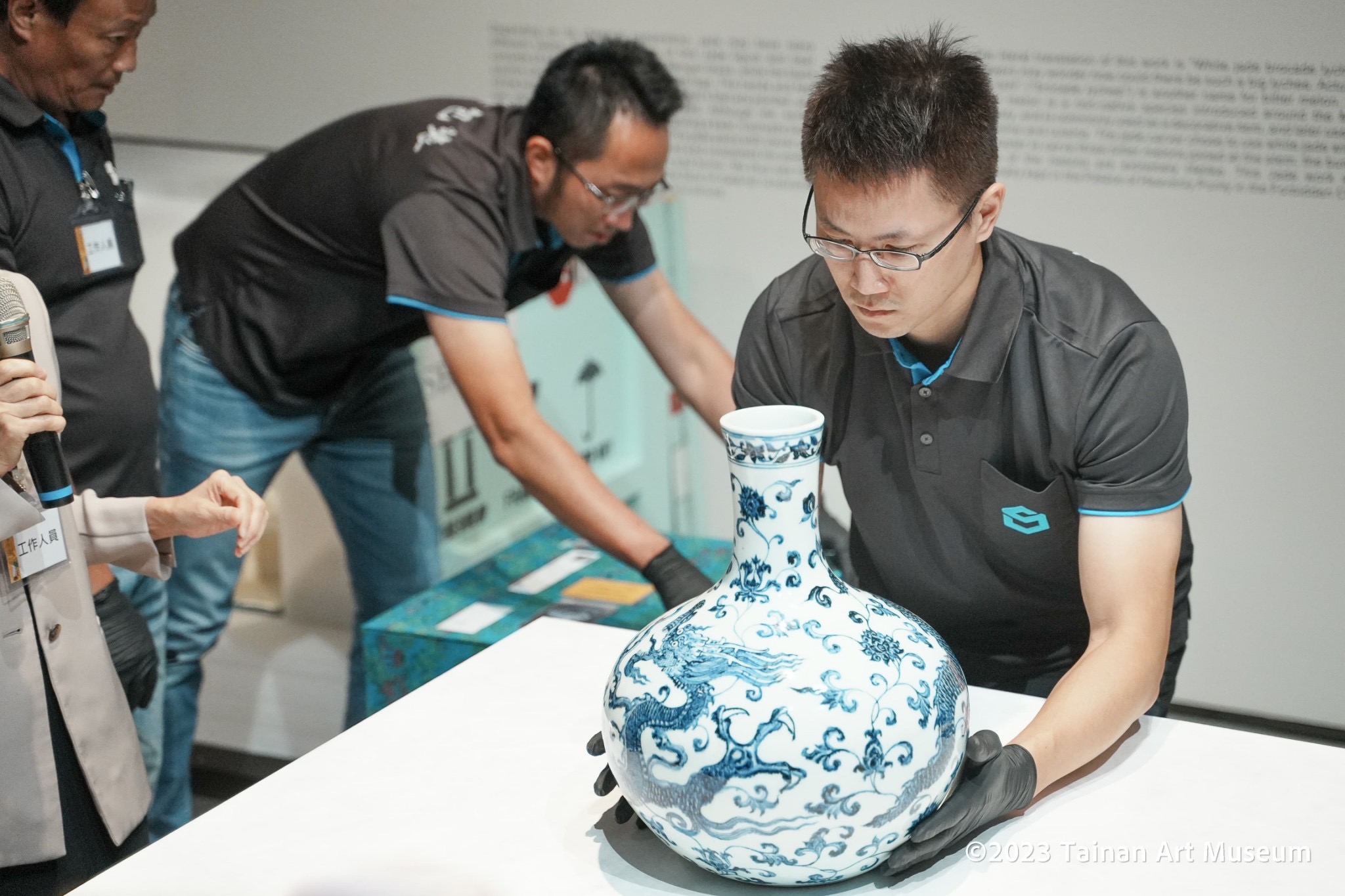 ▲ 現場實際開箱〈明 永樂 青花穿蓮龍紋天球瓶〉。(南美館提供)