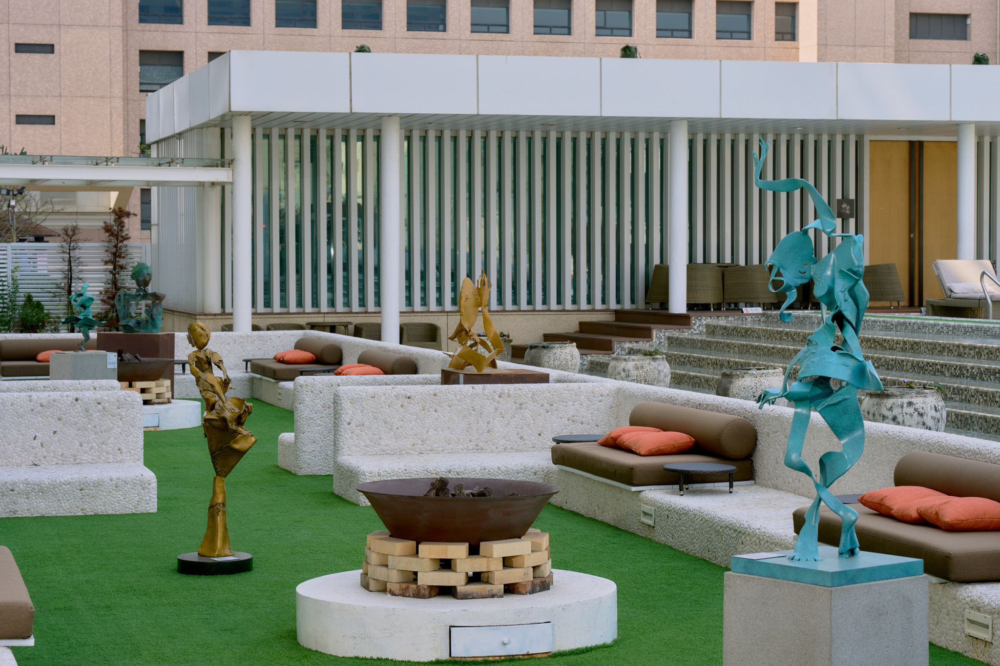 飯店四樓的露天草皮休憩區,則是以出自國際雕塑大師李光裕的銅雕作品來打造池畔祕密花園,李光裕大師來自高雄、汲取本土風情融合人生養分,在雕塑作品中發揮東方人文特色,爾後至西班牙馬德里藝術學院專研西方雕塑技法,以高超圓融的深厚底蘊,形塑跨越文化的片狀線條與鏤空結構,在東西方元素中撞擊出蘊含個人獨特風格的強烈表現。李光裕時常在世界各地受邀展覽,這次展覽中就可見到曾在新加坡濱海灣花園展出,描述人們樂在工作勇於接受挑戰的「風影」、以及獲邀藝壇盛事2017威尼斯雙年展裡榮獲盛讚的「思」與「隨欲寶牛」,透過銅雕輾轉呈現的空靈美學,啟發人們對生命思考的至高境界。