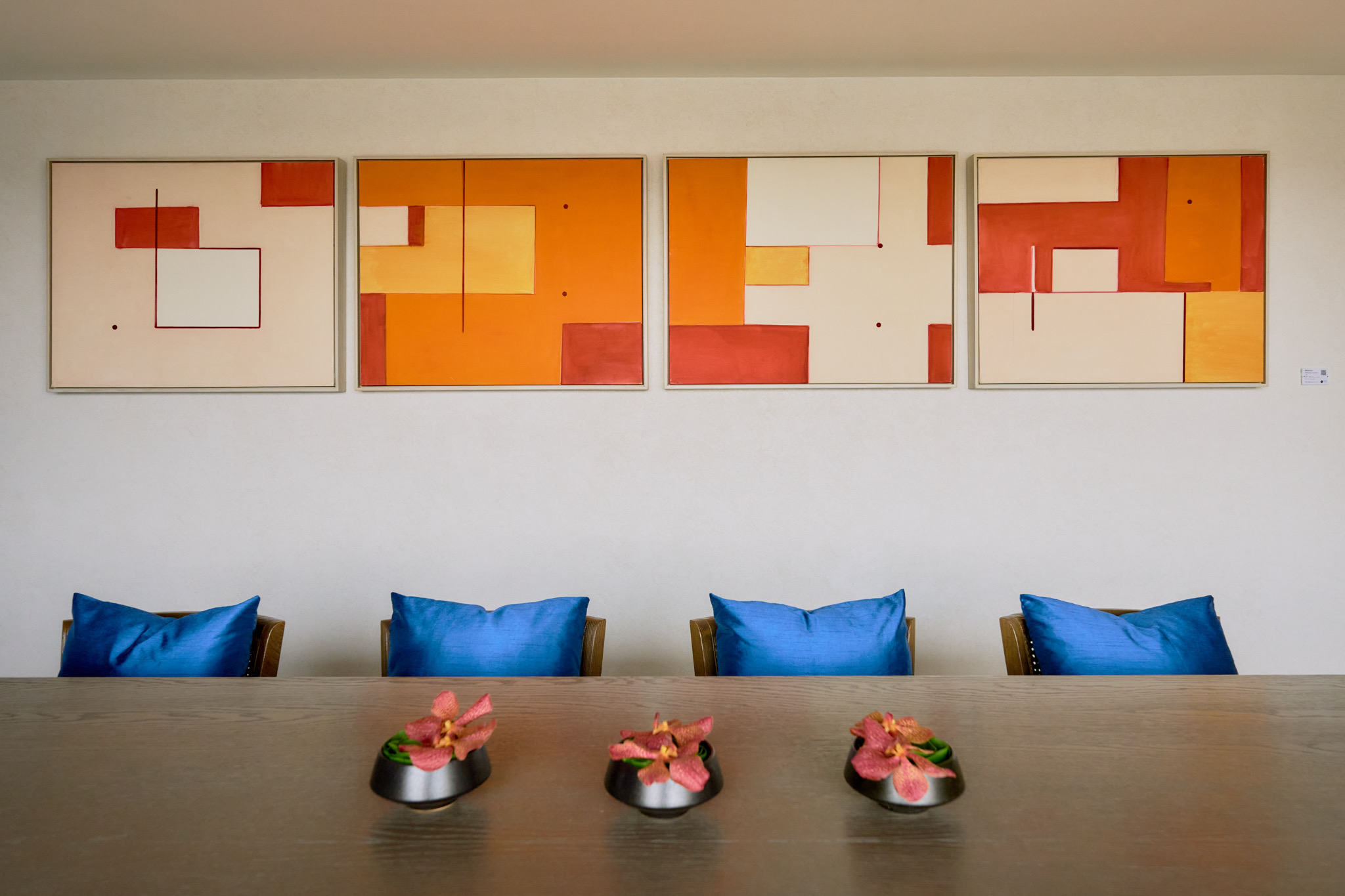 霍剛1932年出生於南京,隨著當時國民政府遷移來台後,跟隨台灣最早從事抽象繪畫、現代藝術導師李仲生習得畫藝,1964年前往米蘭投入歐洲生活,吸收西方藝術觀念並揉合東方書法與金石印刻等元素,呈現出有別於狂亂抽象派系的寧靜畫風,運用單純輕快筆觸,綴上明朗色彩,將點、線、圈構成舞動的幾何圖形,創造出風格單純卻不單調的崇高生命力。本次於飯店14樓行政樓層展出的抽象四連畫,以不對稱的矩形搭配長短不一的線條,大量活潑的黃橙色緩和了氣氛隆重的會議室,而貴賓廊裡三張極簡繽紛的圓幅組合,則宣告著春天降臨的氣息。