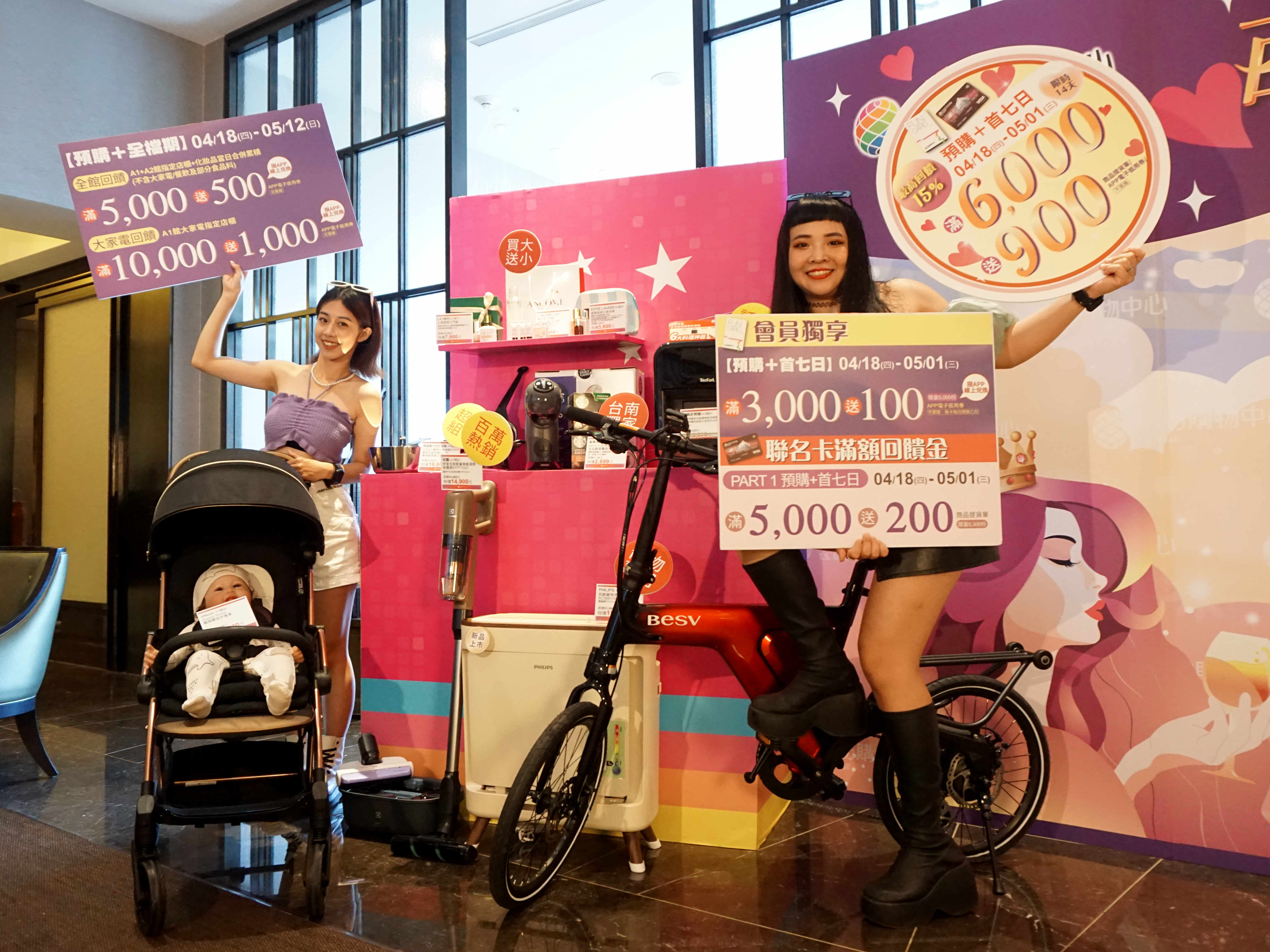 南紡購物中心「百變女王 無限可能」母親節檔期自18日至24日進行預購,正檔期25日至5月12日。預購及正檔期於A1、A2館指定店櫃購滿5,000元送500元電子抵用券(可累贈)、於A1館大家電指定店櫃購滿10,000元送1,000元電子抵用券(可累贈)。預購及正檔首七日持會員紡卡FunCard於兩館指定的會員集點店櫃購滿3,000元送100元電子抵用券(不累贈)、於兩館指定業種品牌購滿6,000元送100元電子抵用券(可累贈),同時持南紡聯名卡於兩館刷滿5,000元送200元商品提貨單(不累贈)。