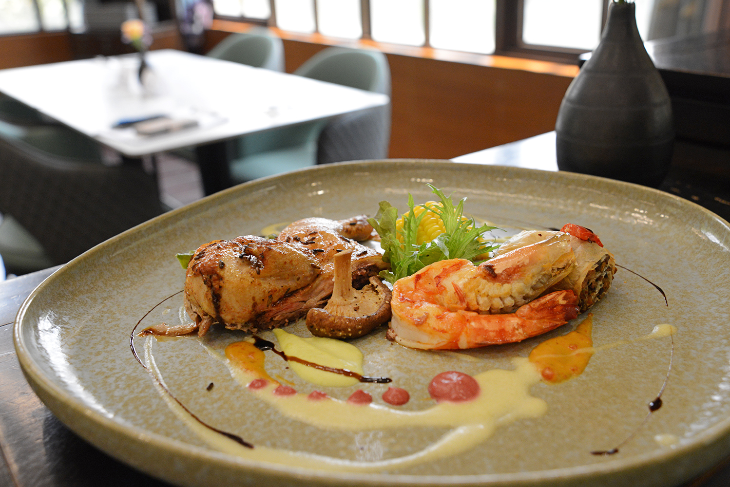 花季度假飯店「覓堂餐廳」覓堂餐飲團隊,以夏季清爽味覺作為發想,晚餐新設計出「爐烤花季薰衣草普桑春雞」、「炭烤新西蘭特級菲力牛排」、「煎挪威鮭魚拼 虎蝦魚卵奶油醬」、「炭烤台灣戰斧豬排佐黑椒蘑菇醬汁」以及「黑松露野菇莫札雷拉起司卡薩提亞薄餅」、「未來肉丸時蔬香料奶油燉飯」兩道素食主菜等,其特色如下: