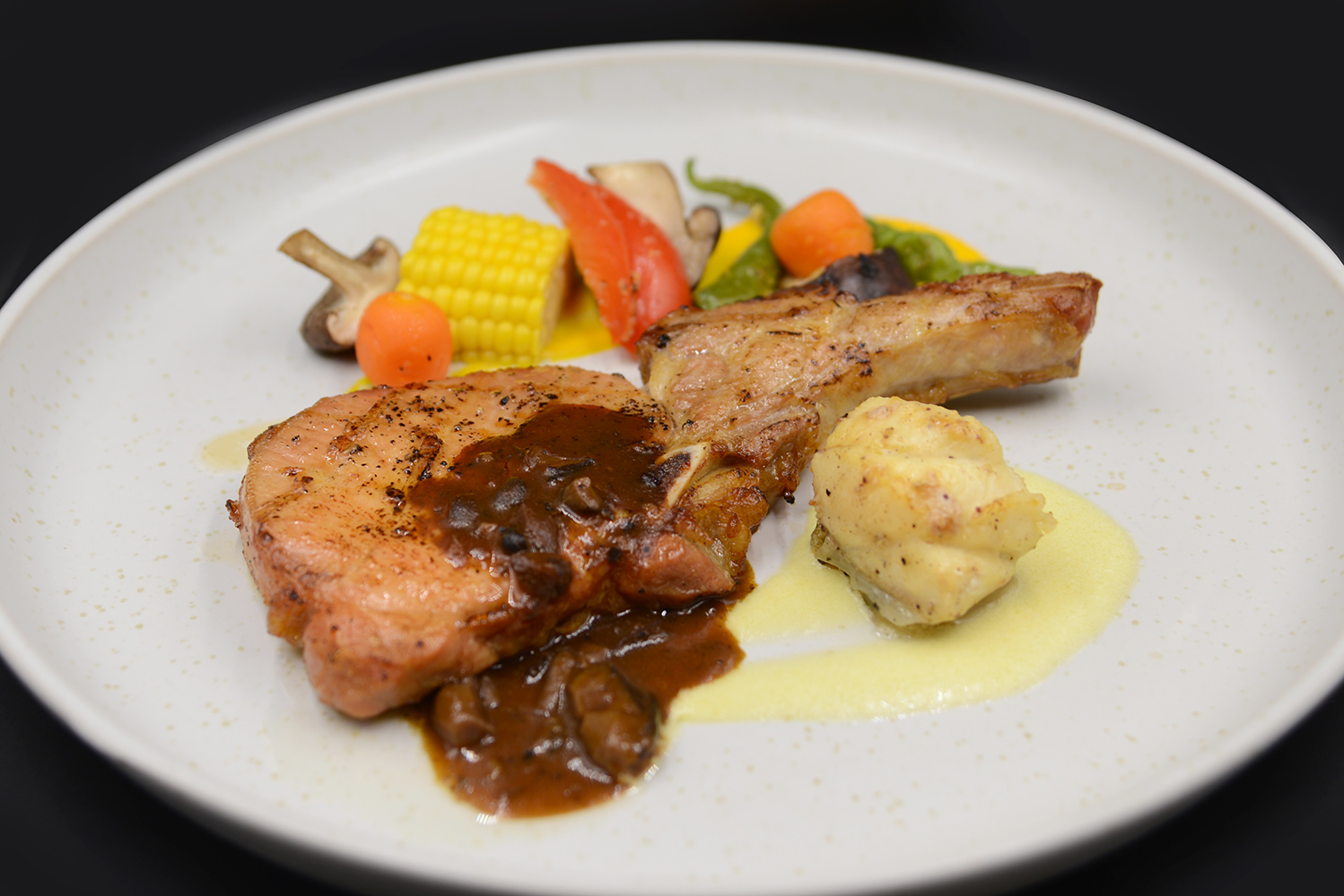 台灣戰斧豬排為主料,經炭烤而成,外焦裡嫩,肉質鮮美。 搭配上濃鬱的黑椒蘑菇醬汁,為整道菜帶來了獨特的辣味。每一口都充滿了炭烤的獨特風味和黑椒蘑菇醬汁的濃鬱味道,彈性脆口與鮮嫩的口感與層次豐富,讓人回味無窮是美食愛好者絕佳的選擇。
