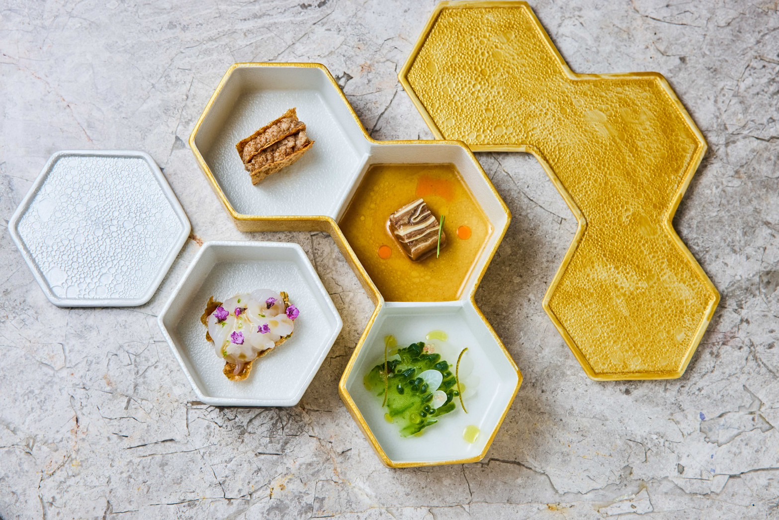 此外,秉持T+T和初魚對於風味及口感的同等重視,Johnny主廚在此次菜單設計上展現了多種層次變化;以T+T發想的「佛跳牆茶碗蒸」為例,採用海蔘、花菇、魚翅、花膠、栗子等食材製作,將佛跳牆的甘美鮮醇和老母雞上湯的濃郁旨味,完美帶入蒸蛋之中。而由初魚發想的「鴨胸」料理,則選用源於法國血鴨的台灣(彰化)胭脂鴨,在烹調過程需先回溫靜置一小時後,再用鐵板香煎,佐以鴨骨熬煮而成的濃縮醬汁,展現胭脂鴨獨特的鮮甜野味。