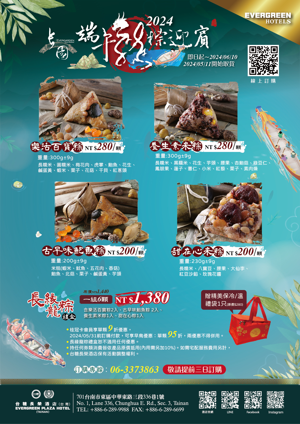 台糖長榮酒店(台南)主打「長緣龍粽禮盒」現正優惠價1,380元/盒,深受顧客支持的樂活百寶粽迎合現代養身過節的樂活需求,使用在地的油蔥和芋頭,加入膠質豐富的虎掌及北菇等食材,料多味美。古早味鮑魚粽選用米糕鋪底及鮮味十足的大連鮑,鮮香濃郁唇齒留香。養生素米粽一次攻略紅藜、腰果等養身食材,搭配香鹹的素肉燥,選用咬勁十足的糯米,值得品嚐。承襲南部的口味,也推出甜心米糕粽,使用口感甜美香醇的玫瑰醬調味,帶有天然鹽份的大仙李,搭配紅豆沙,增添鹹甜滋味,享受甜食無負擔。