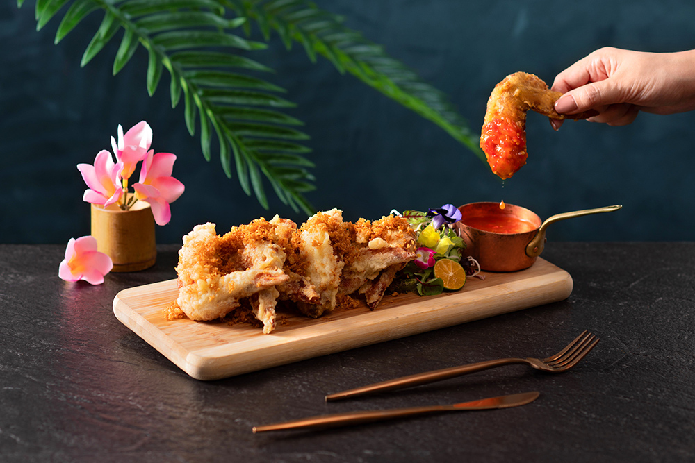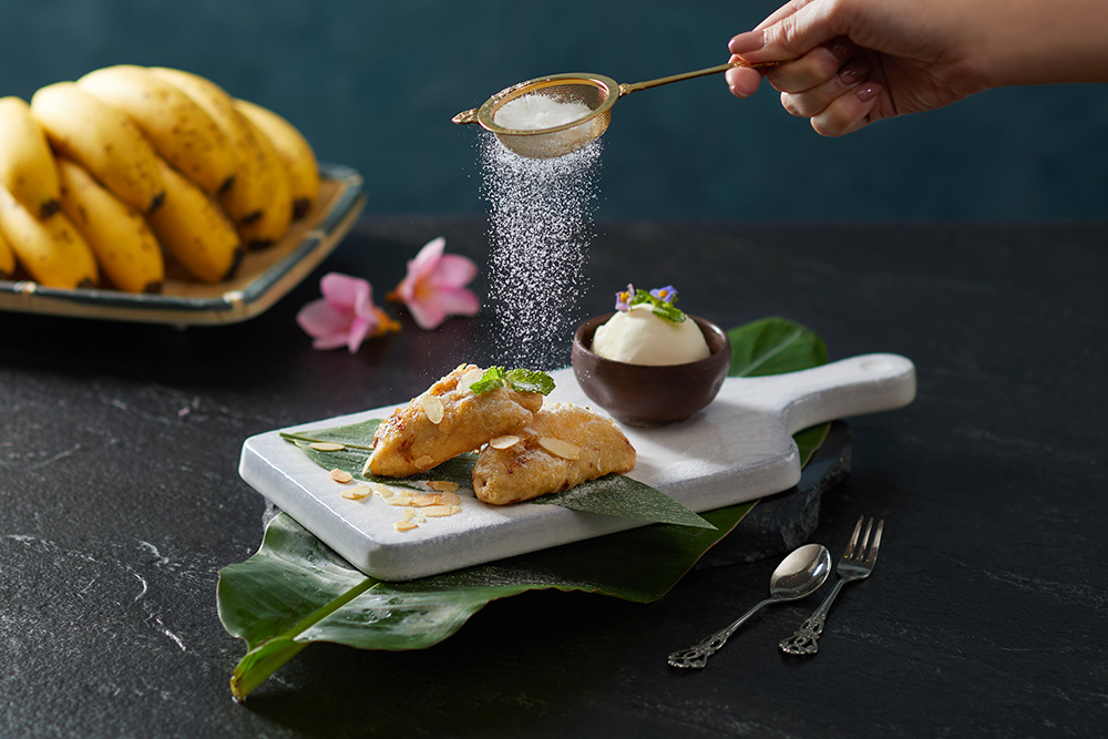必嚐甜品除了泰國經典的「泰式黑白配香蘭紫米布丁」,還有主廚大力推薦的「印尼經典黃金脆皮炸香蕉」,此道菜不僅獲獎無數,更是擊敗西班牙吉拿棒、柏林甜甜圈Krapfen拿過2023 TasteAtlas全球最佳油炸甜點冠軍,裹漿香蕉酥炸後散發強烈的甜香,外脆內軟,再沾裹蜂蜜與糖粉,美味讓人無法抗拒,更為印尼家家戶戶最愛的飯後甜點。並有來自印尼爪哇地帶的傳統甜點「甜蜜香蘭涼粉珍多冰」,用香蘭葉跟糯米粉製成的翡翠色粉條,搭配椰奶、椰糖跟波羅蜜,奶香中帶著熱帶甜果的果香,香氣十足、消暑冰涼,絕對是八月必吃的最佳甜點。
