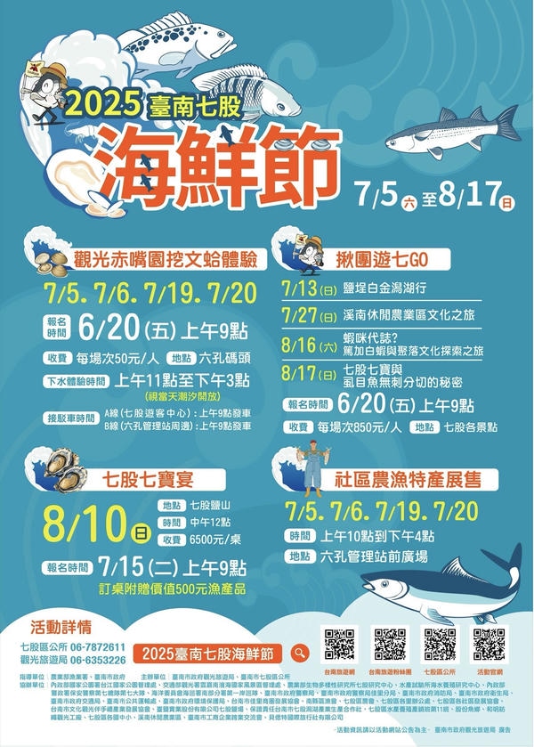 由臺南市政府觀光旅遊局與七股區公所攜手共同辦理暑假親子人氣活動「2025臺南七股海鮮節」,即將於7月5日至8月17日期間熱鬧展開,包含最受民眾喜愛的《觀光赤嘴園挖文蛤體驗》、《揪團遊七GO》一日遊程、美味豐盛的《七股七寶宴》以及《社區農漁特產展售》等系列活動。
