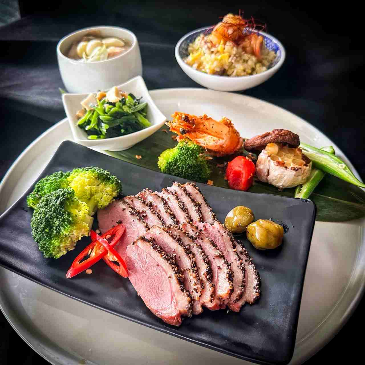 凱撒趣淘漫旅台南秋冬新菜單「味蕾輕旅行-台南趣淘美饌套餐」選擇多樣,「蒜香嫩羊套餐」選用澳洲羊小排,結合港式手法佐以學甲蒜頭小火慢煎,香氣撲鼻;「牛香滿溢套餐」將特選牛肉融入左鎮樹子,手工慢槌細打成型達150g的大獅子頭,紮實飽滿最過癮;酸甜開胃的「油香豚饗套餐」將低溫慢烤肋排搭配楠西梅子與茄汁,兼具創意與美味;「秘製鴨胸套餐」以櫻桃鴨胸搭配優格醬汁,帶來清爽口感,與副餐的學甲蒜酥炒蝦、柳營什錦炒飯一同品嚐特別合適。入住位在曾文水庫內的凱撒趣淘漫旅台南當然不能錯過,需於一週前透過官網預約才有機會品嚐的「旬野風味套餐」,主廚挑選水庫養殖筍殼魚搭配左鎮樹子清蒸,清甜爽口、展現食材自然風味。
