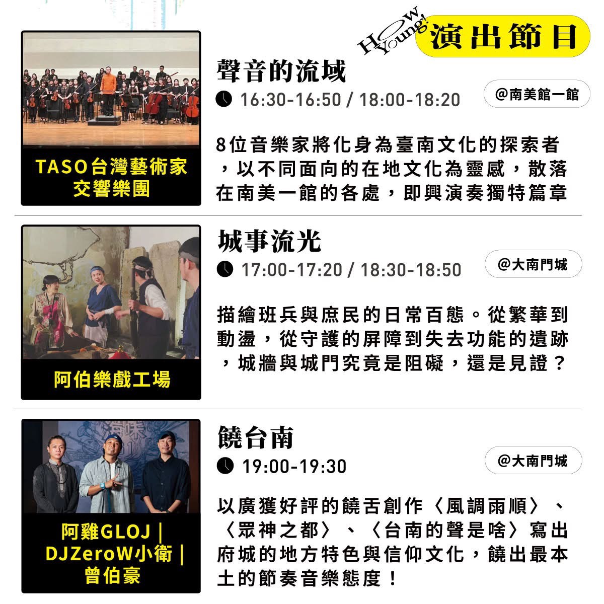 穿越小巷來到鷲嶺食肆,暴羅WALK以《漫才之流量密碼》近距離帶來笑聲與驚喜;雞屎藤舞蹈劇場《葫蘆巷春夢》取材自葉石濤短篇小說,以肢體重現文學記憶;南美館一館則由臺灣藝術家交響樂團演出《聲音的流域》,以即興方式在館內不同空間展開聲音流動。壓軸回到大南門城,由阿伯樂戲工場《城事流光》重現城牆興建風華,最後由阿雞GLOJ、DJ ZeroW小衛、曾伯豪共同演出的《饒台南》,以最在地的節奏與音樂態度為藝文之旅畫下完美句點。