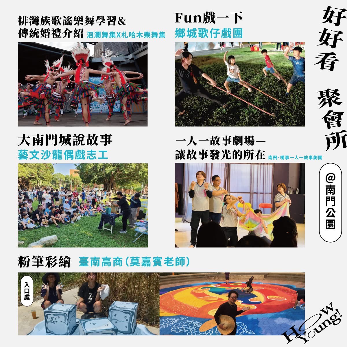 文化局指出,活動當日在南門公園同步推出「好好看聚會所」,集結多元藝文體驗與互動展演。包含家齊高中嘻研社、洄瀾舞集、布可劇團、布紙是偶小劇場、南飛.嚼事一人一故事劇團、米雪文化、藝文沙龍偶戲志工及鄉城歌仔戲團等團隊,共同展現藝術跨越年齡與族群的能量。現場另有臺南高商莫嘉賓老師帶領粉筆彩繪創作,新藝獎得主小聲回收舉辦聲音互動工作坊,並邀請多所臺南地方文化館共襄盛舉,出動行動展示攤車一同逛大街。更多活動資訊請上臺南藝術節官方網站:https://tnaf.tainan.gov.tw/或臉書粉絲專頁查詢。