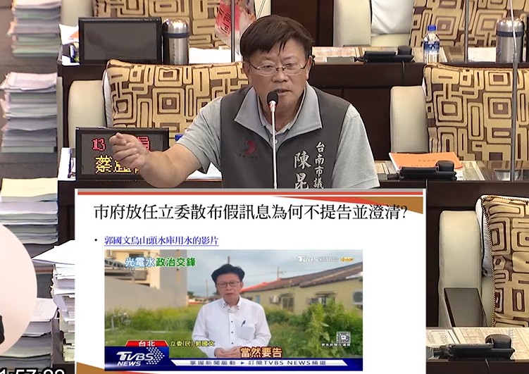 陳昆和話鋒一轉,在議事廳直接點名民進黨立委郭國文散佈假訊息,質疑市府放任郭的行徑。他說,郭國文受訪時主張「烏山頭水庫是灌溉用水」,但實際上根據烏山頭水庫運用要點總則,就證明烏山頭水庫也支援民生用水。他說,郭國文身為台南第二選區立委,沒幫市民發言,卻公然說謊,更是法院認證拿取能源業者的政治獻金,被外界質疑是「門神」。他是民進黨台南市黨部主任委員,是政治選舉的領頭羊,公然說謊還想告質疑者,民主進步黨豈不是說謊執政黨。