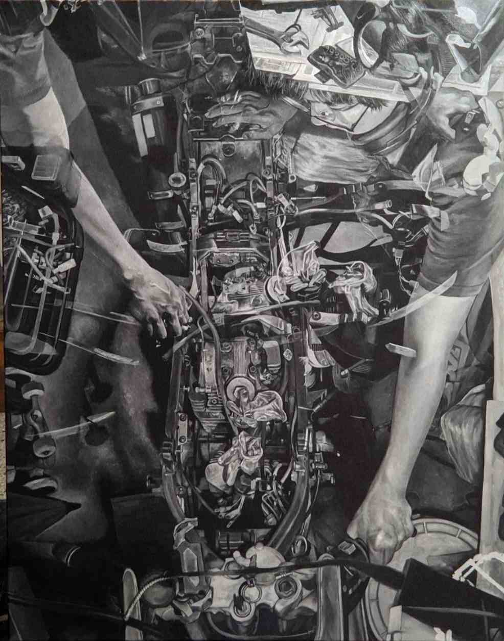 其中西畫類大專組特優的劉柏佑同學,其作品<Repair&Fixed>,利用細緻的繪畫技法表達引擎可以說是一台車的心臟,只要內部零件有所損壞,整台車運作都會出問題,而劉同學時常覺得自己不受控的裂成兩半,有時充滿自信,有時情緒低落,兩個自己不停在爭奪控制桿,而劉同學將這兩個截然不同的自己交疊,共同修復其的心臟,讓引擎將血液泵送全身,實屬佳作。