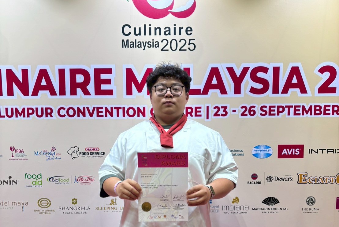 台南應用科大養生休閒管理系再次展現教學實務卓越成果,日前由鄭傑夫助理教授及帶領學生郭亞恩、林以新兩位同學於09月21至24日前往馬來西亞,參加2025FHM馬來西亞吉隆坡廚藝大賽,以精湛西餐鮭魚主餐競賽及外場水果火焰桌邊烹調服務,兩項比賽贏得評審高度肯定,一舉奪下1銅1佳作的好成績,全校師生咸感與有榮焉。