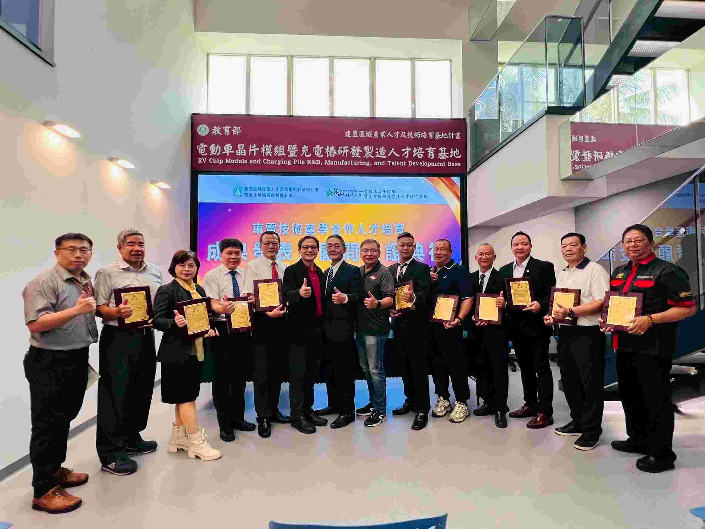 崑山科大行政副校長鐘俊顏表示,本次成果發表整合校內跨領域系所與智慧製造能量,建置內容包含車用晶片測試平台、電池管理系統(BMS)與功率模組檢測、自動化機械手臂操作、產線搬運與製程模擬、AI AOI 光學檢測與智慧巡檢、MES 製造管理與品質追溯系統、EV 組裝模擬教室,以及充電樁研發、檢測與維修站等核心場域與技術。產線全面導入 IATF 16949 汽車產業品質管理精神,並於典禮中頒發相關證書,象徵該校在品質控管、智慧製造與車電工法訓練方面,已具備與國際汽車供應鏈接軌的能力。他也進一步指出,本產線落實「教學即產線、產線即教室」理念,讓教師得以使用真實產線環境進行教研活動,同時提供學生多階段、跨模組的技術實作訓練,從晶片、模組、製程到維修形成完整的人才養成鏈,強化其跨域實務能力。